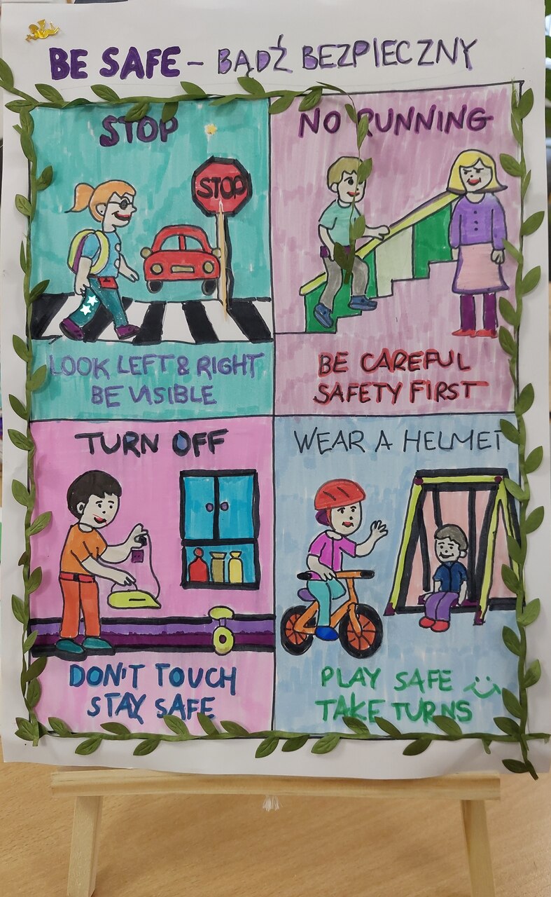 W październiku odbył się konkurs Be safe - Bądź bezpieczny adresowany do uczniów klas 1-3. Piętnaścioro dzieci stworzyło piękne prace konkursowe o tematyce bezpieczeństwa. W holu na parterze można podziwiać dzieła młodych artystów.