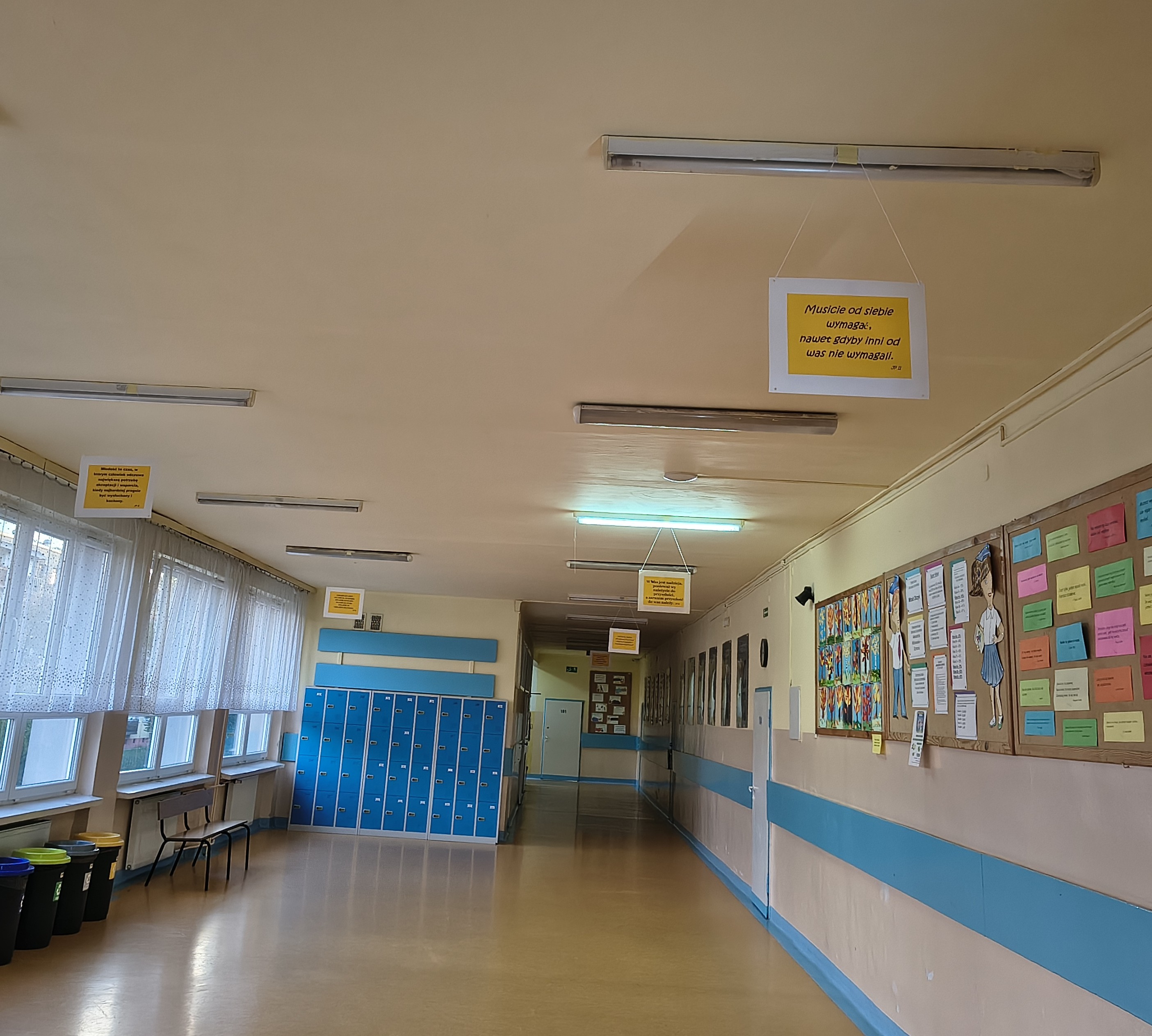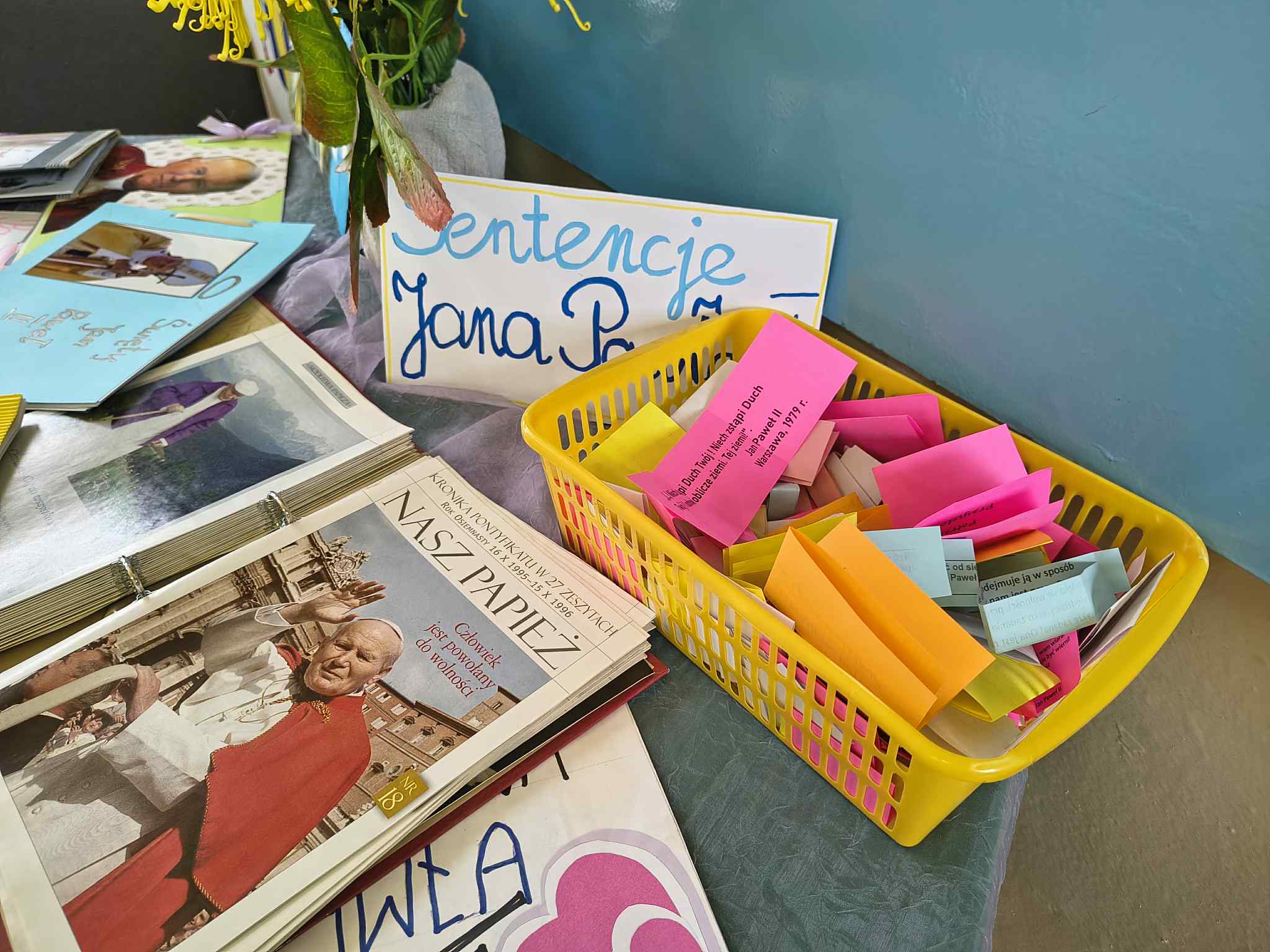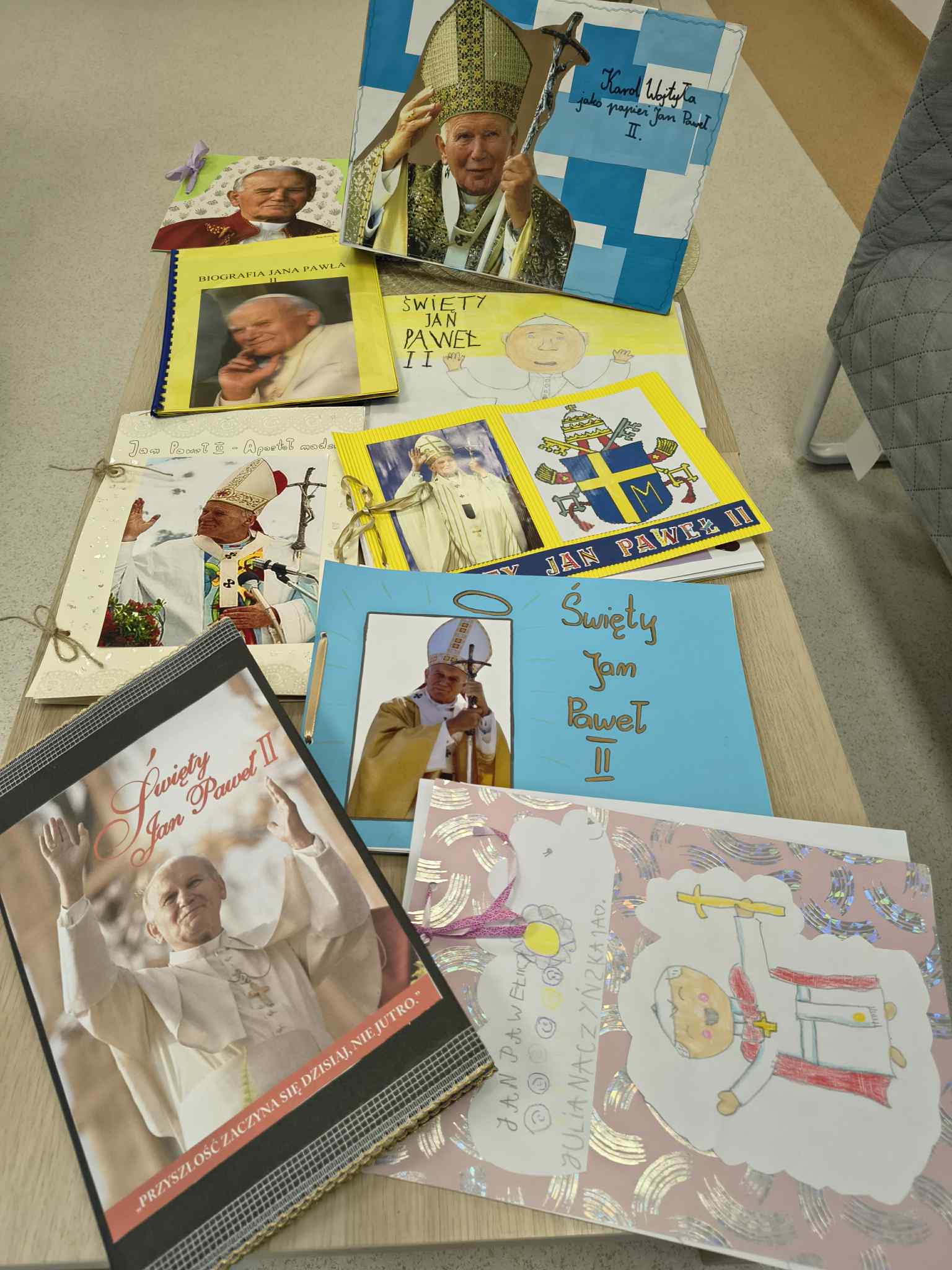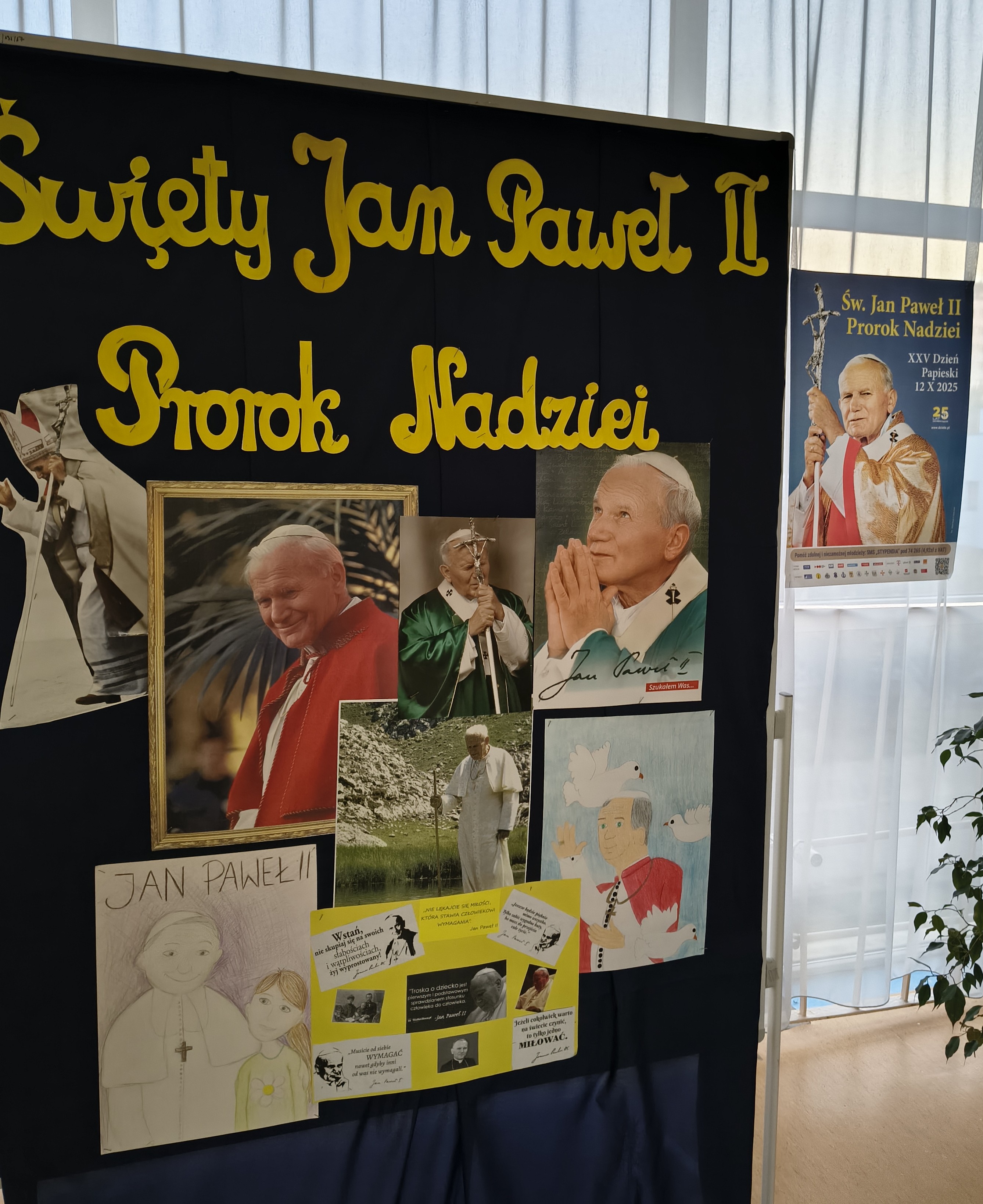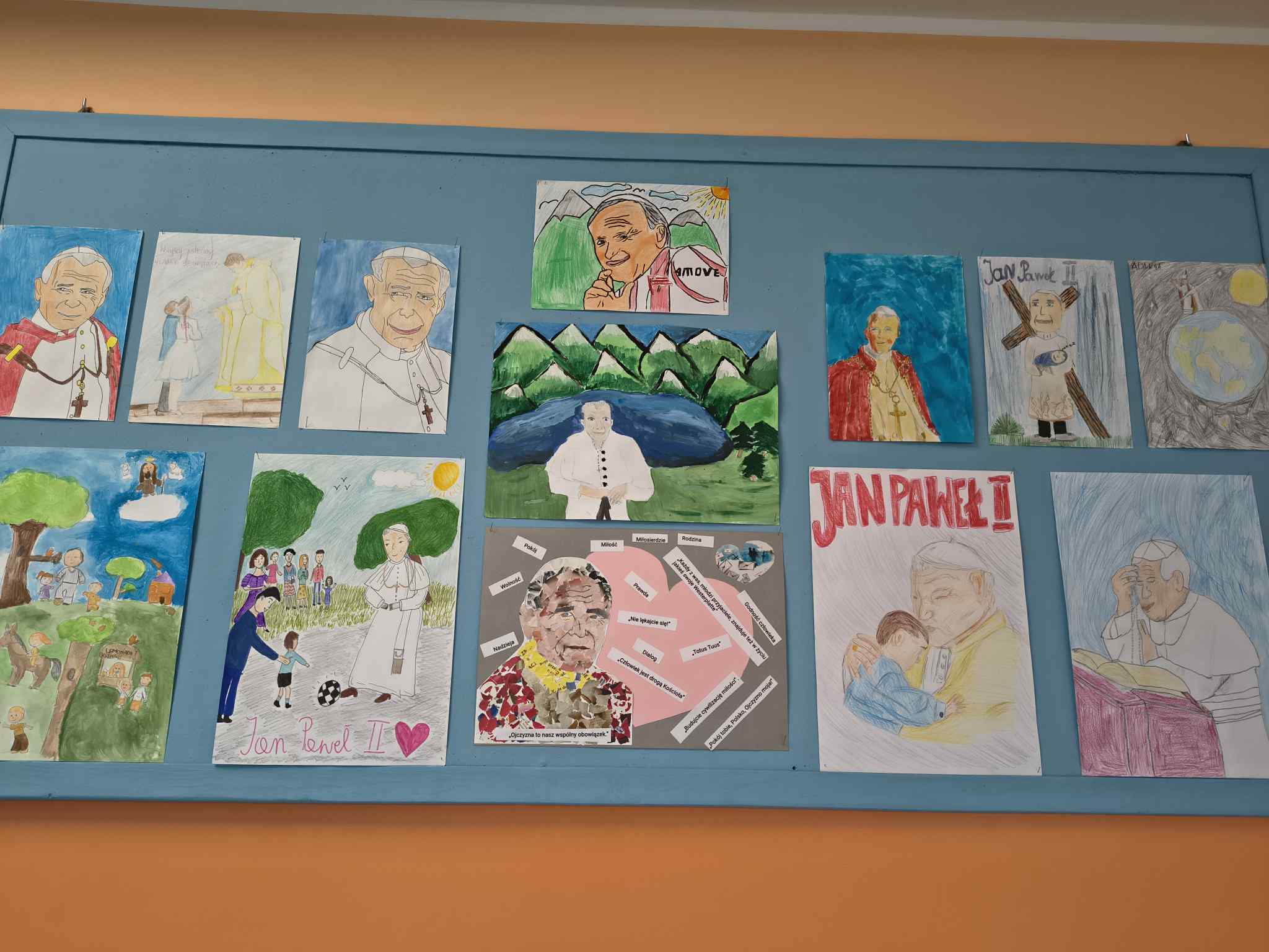 W szkole również pamiętaliśmy o tym wielkim Polaku. Tegorocznym hasłem Dni papieskich było: Jan Paweł II - Prorok nadziei. Panie: E. Rutkowska i P. A. Grodzicka przygotowały wystawę na pierwszym piętrze dotyczącą Jana Pawła II. Uczniowie mogli zapoznać się z Jego życiem i działalnością poprzez różnego rodzaju albumy oraz wywieszone sentencje, które mogą stać się mottem życia niejednego z nas. Dodatkową atrakcją proponowaną chętnym uczniom z naszej szkoły były konkursy. P. E. Szargut przygotowała konkurs plastyczny dla klas 1-8, P. Rutkowska konkurs na album o Janie Pawle II, P. Masłowska konkurs wiedzy w formie sztafety dla klas 3-4 oraz 5-6. Każdy mógł sprawdzić swoje umiejętności w wybranej dziedzinie. Pamięć o tak Wielkim, Świętym Rodaku zapewne jest i będzie dla wielu ludzi powodem do dumy i motywacji do tego, aby w życiu dążyć do wielkich rzeczy.