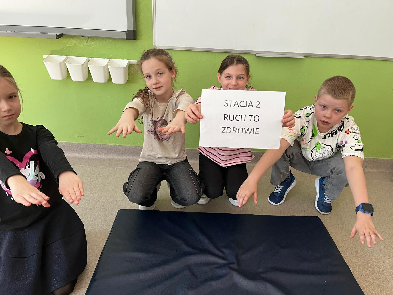 Druga stacja, pod hasłem Ruch to zdrowie, dostarczyła wszystkim sporej dawki energii! Uczniowie z radością wykonywali różnorodne ćwiczenia i zadania ruchowe, przekonując się, jak ważna dla zdrowia jest codzienna aktywność fizyczna.