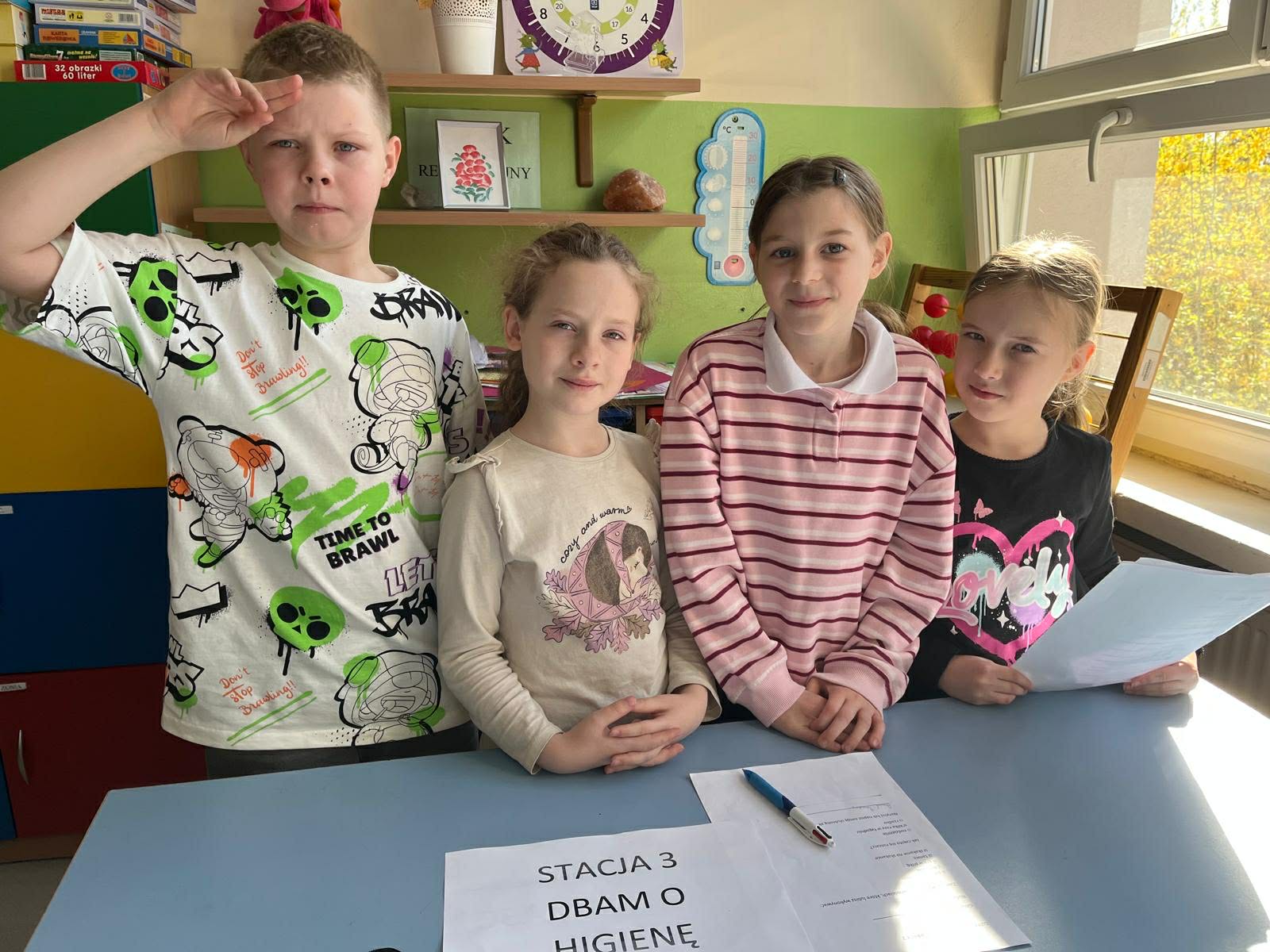 Na trzeciej stacji uczniowie przypomnieli sobie zasady higieny i dbania o zdrowie. Dzięki ciekawym zadaniom utrwalili wiedzę o tym, jak troszczyć się o siebie i swoje otoczenie.