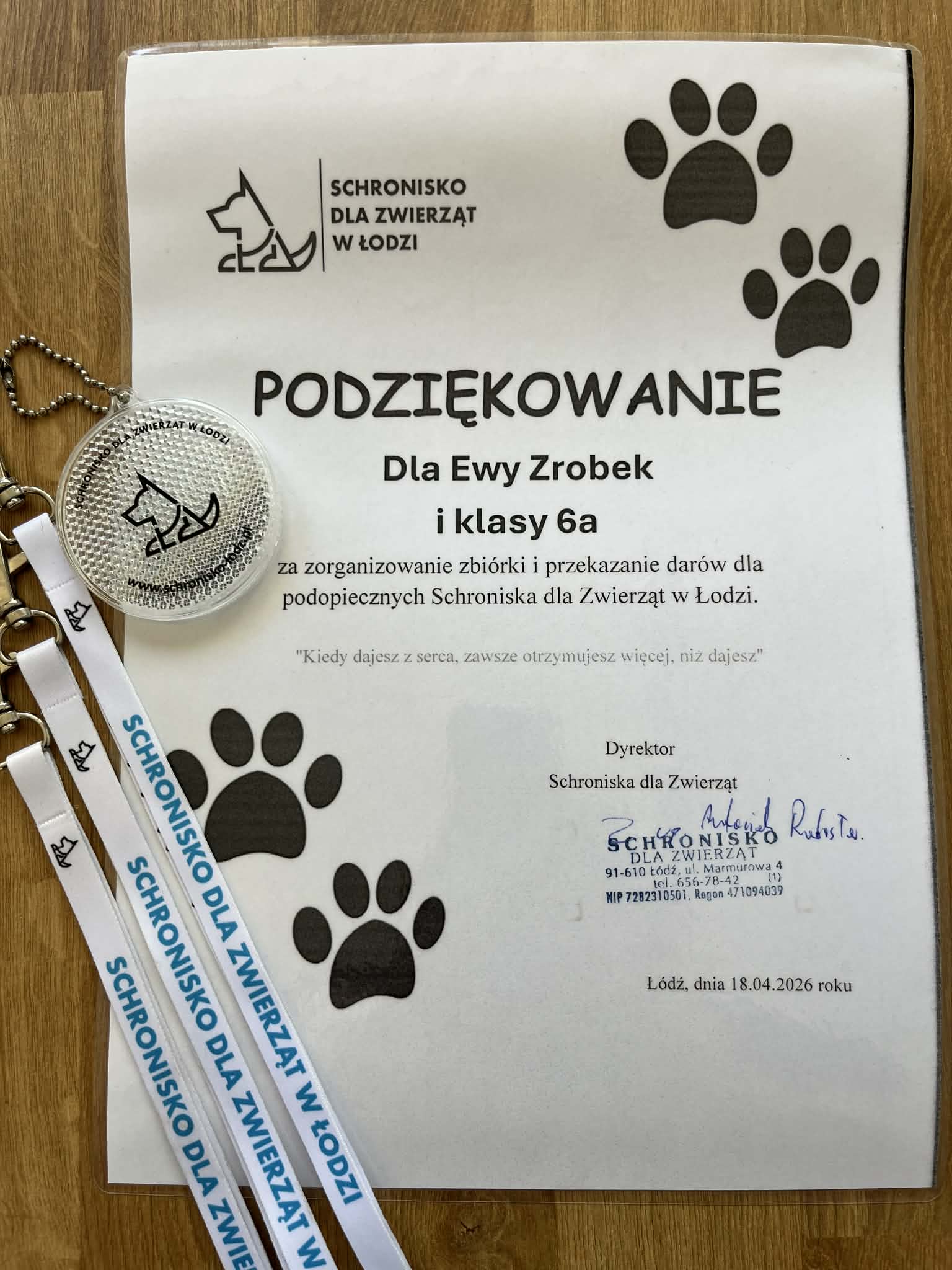Z inicjatywy uczennicy Ewy Zrobek w naszej szkole została zorganizowana zbiórka dla podopiecznych łódzkiego schroniska. Patronat nad akcją objęła klasa 6a, a cała szkoła z energią i zaangażowaniem włączyła się w jej realizację.