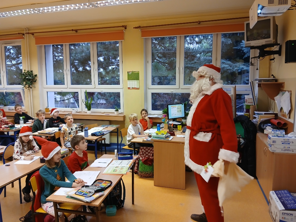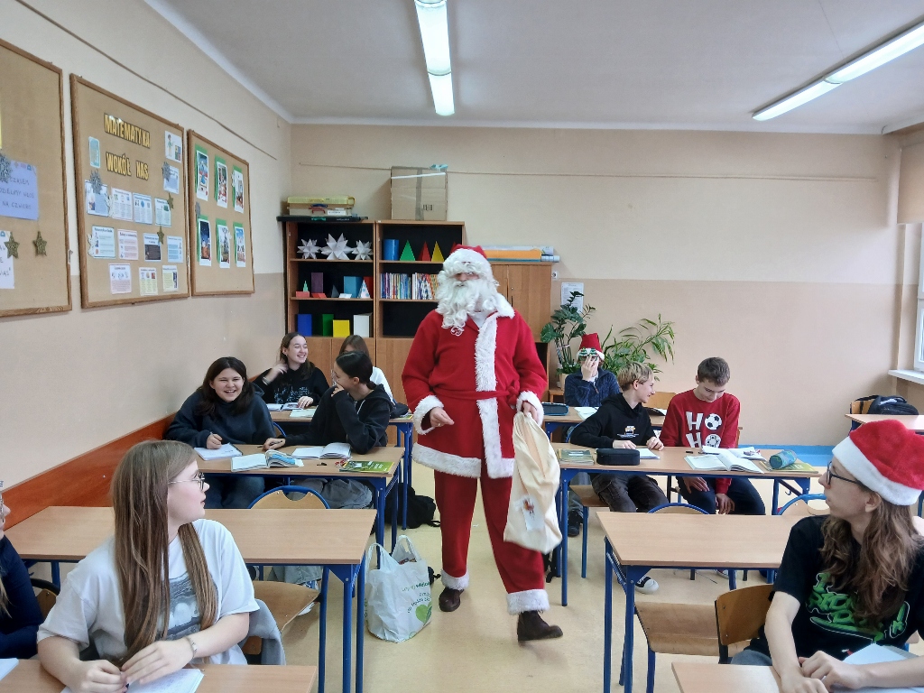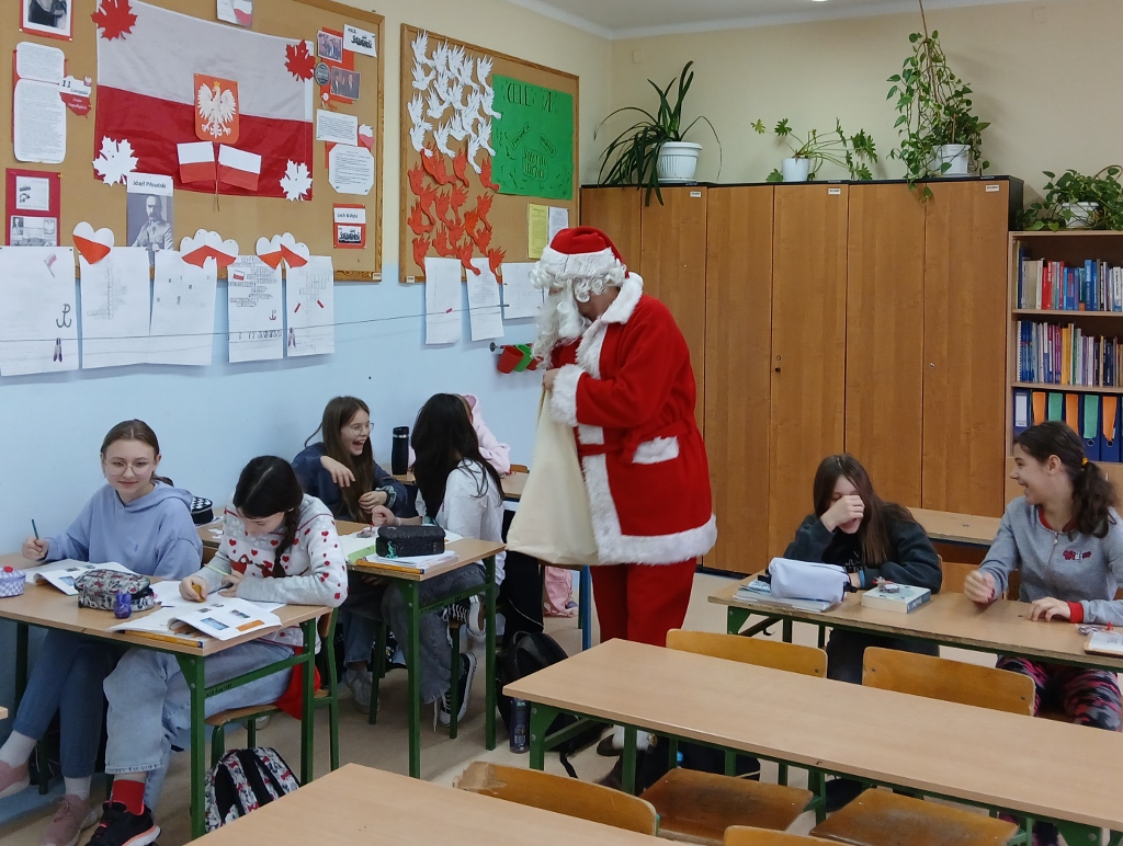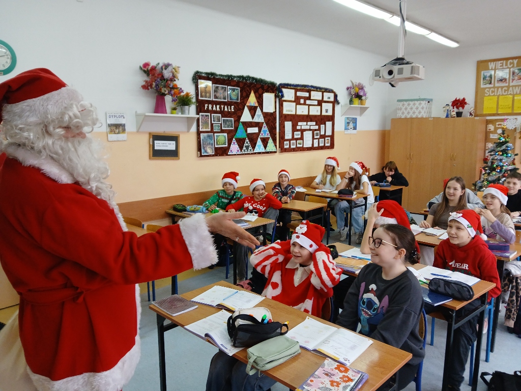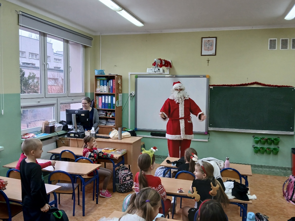Do szkoły dotarł Mikołaj, który obdarował wszystkie dzieci słodkościami. W klasach panowała bardzo wesoła atmosfera, bo Mikołaj - perkusista tańcząc i wystukując skoczne rytmy na blatach szkolnych ławek zainicjował śpiewy kolęd i piosenek świątecznych. Żarty i śmiech rozbrzmiewały w całej szkole.