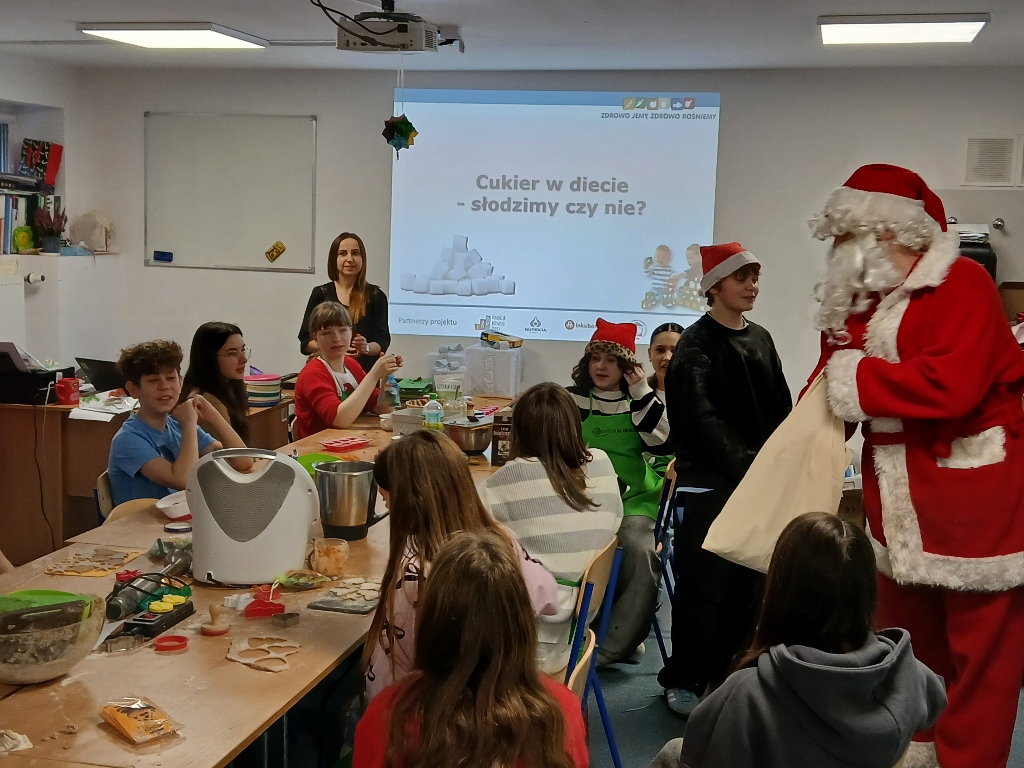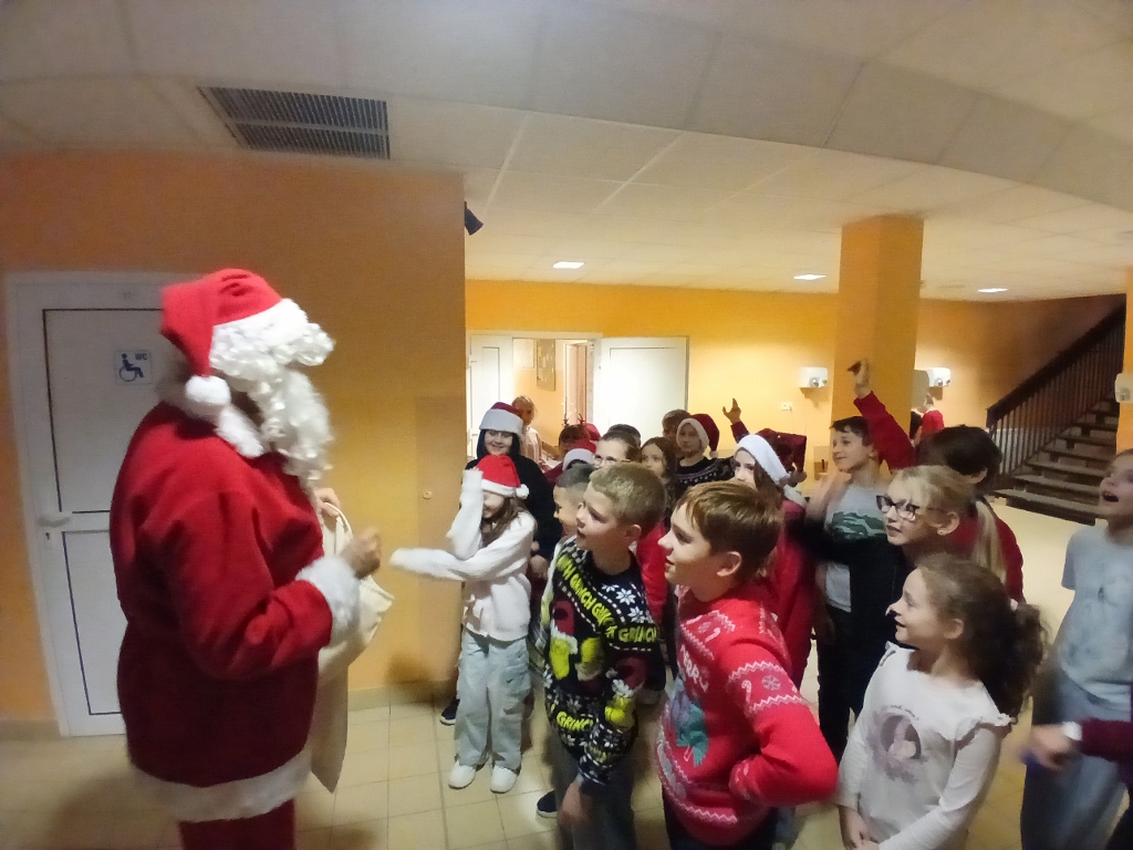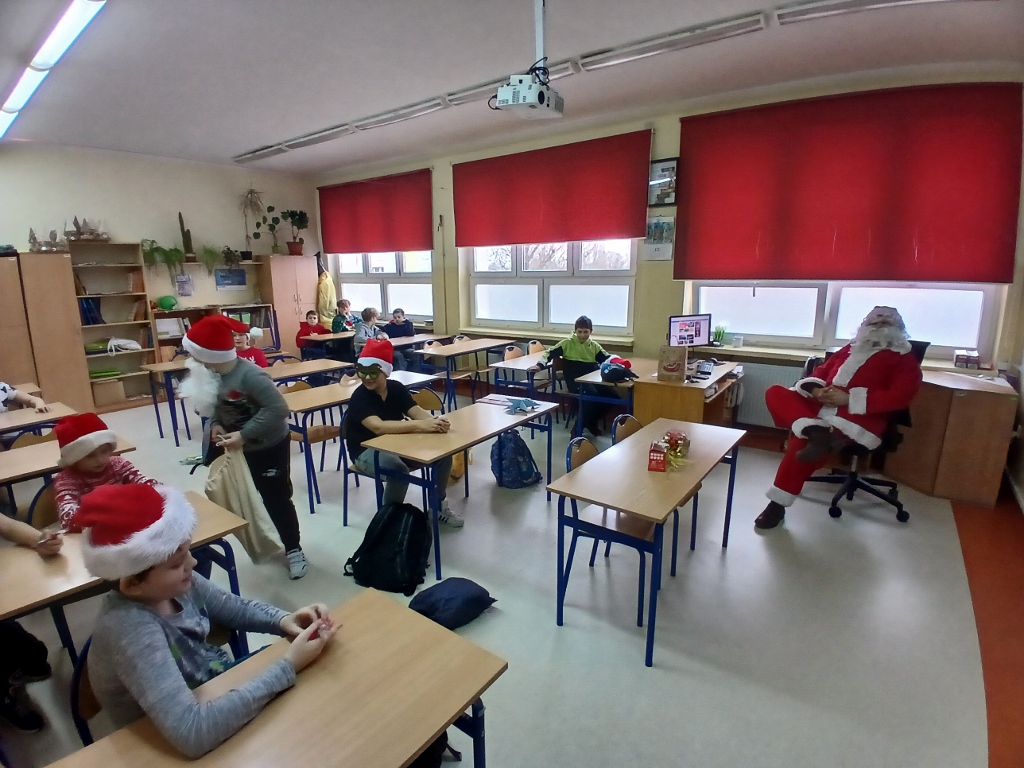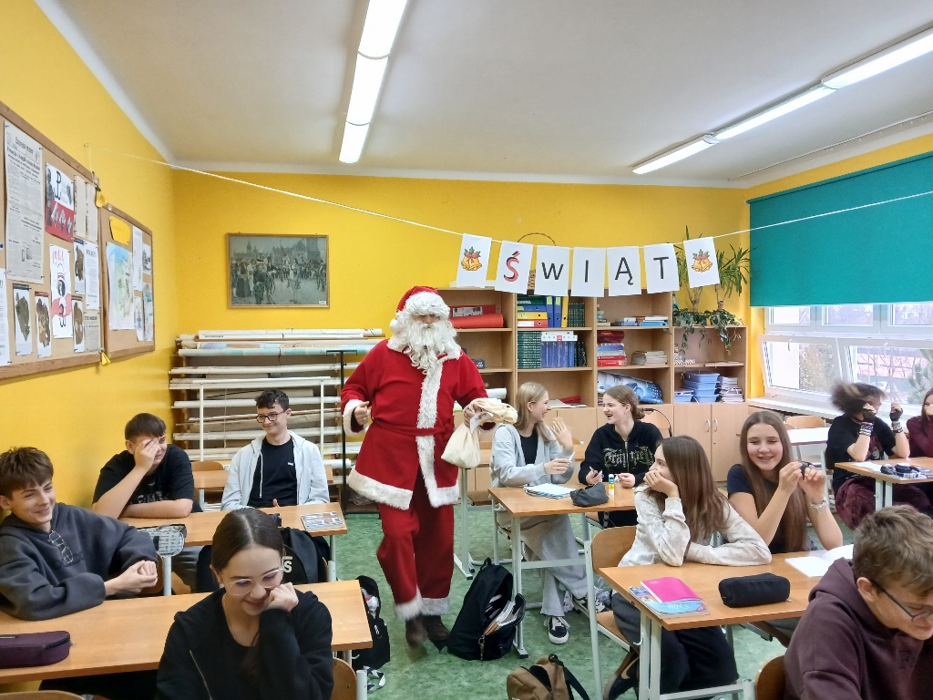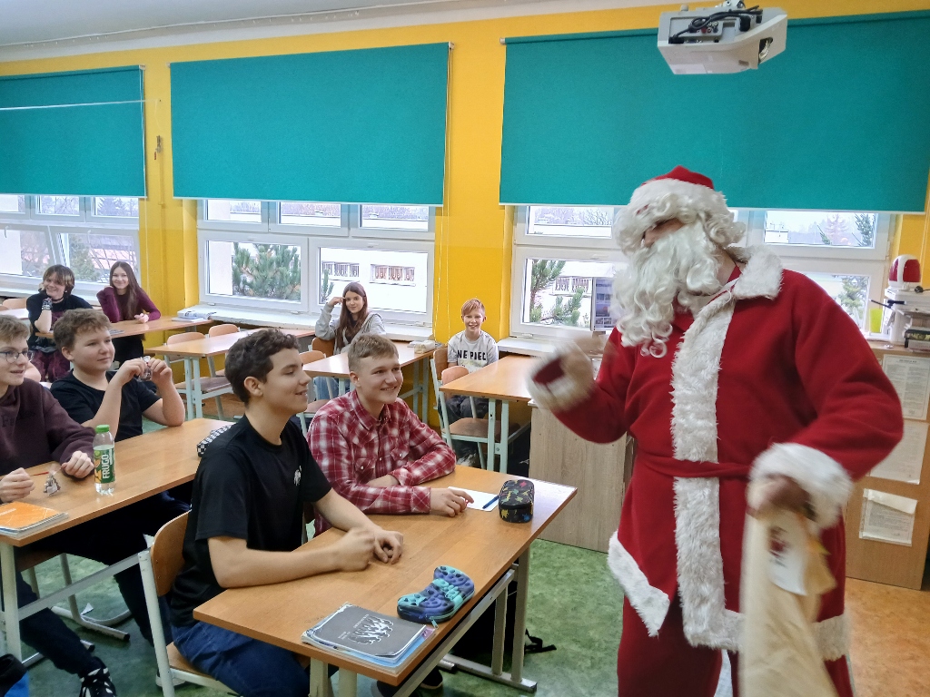Do szkoły dotarł Mikołaj, który obdarował wszystkie dzieci słodkościami. W klasach panowała bardzo wesoła atmosfera, bo Mikołaj - perkusista tańcząc i wystukując skoczne rytmy na blatach szkolnych ławek zainicjował śpiewy kolęd i piosenek świątecznych. Żarty i śmiech rozbrzmiewały w całej szkole.