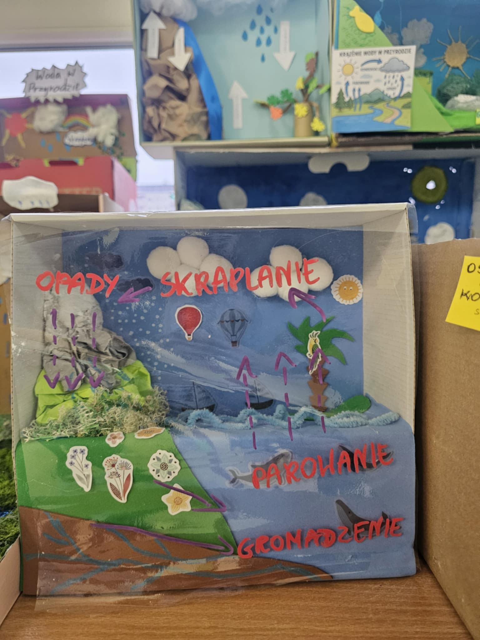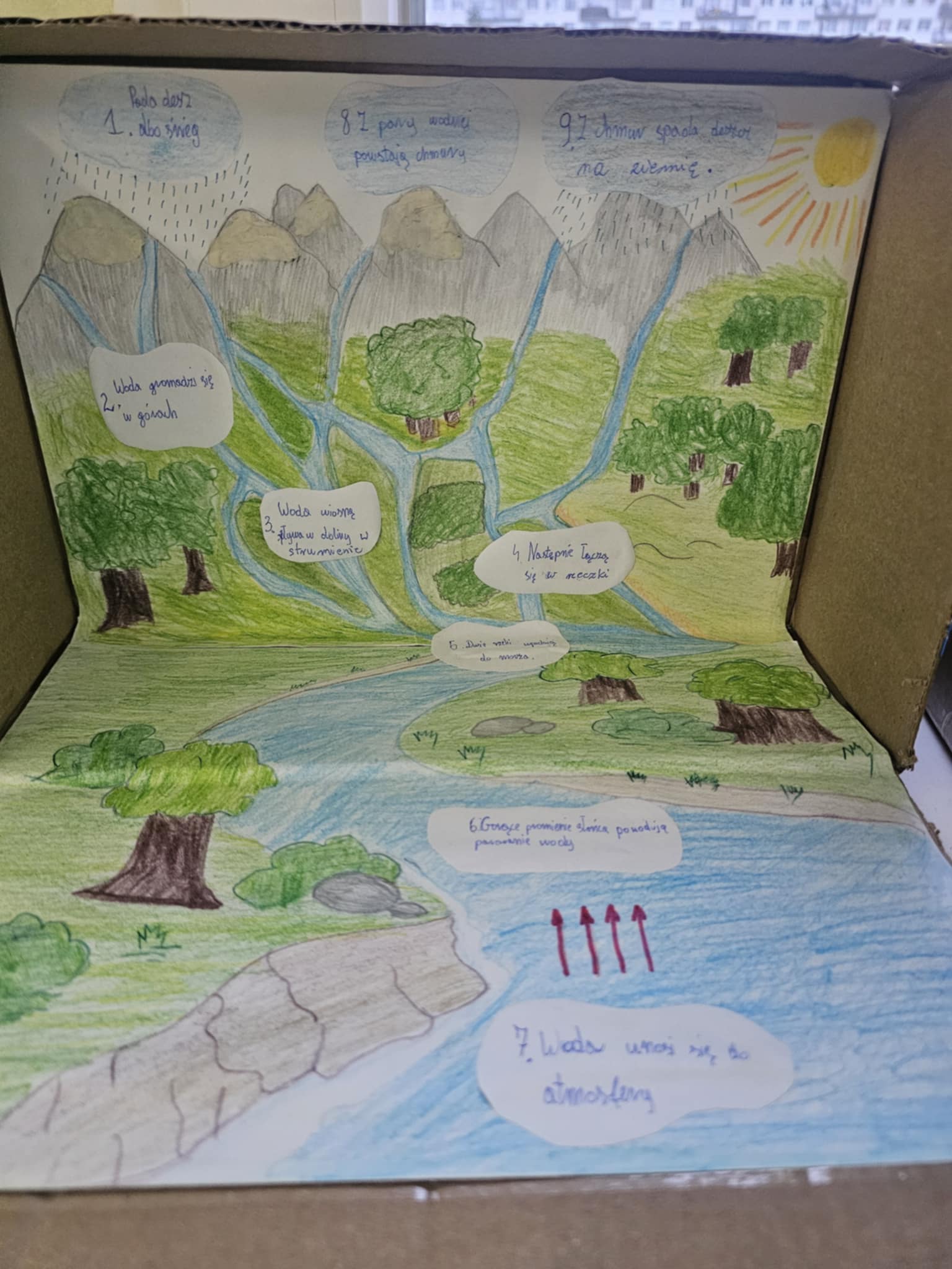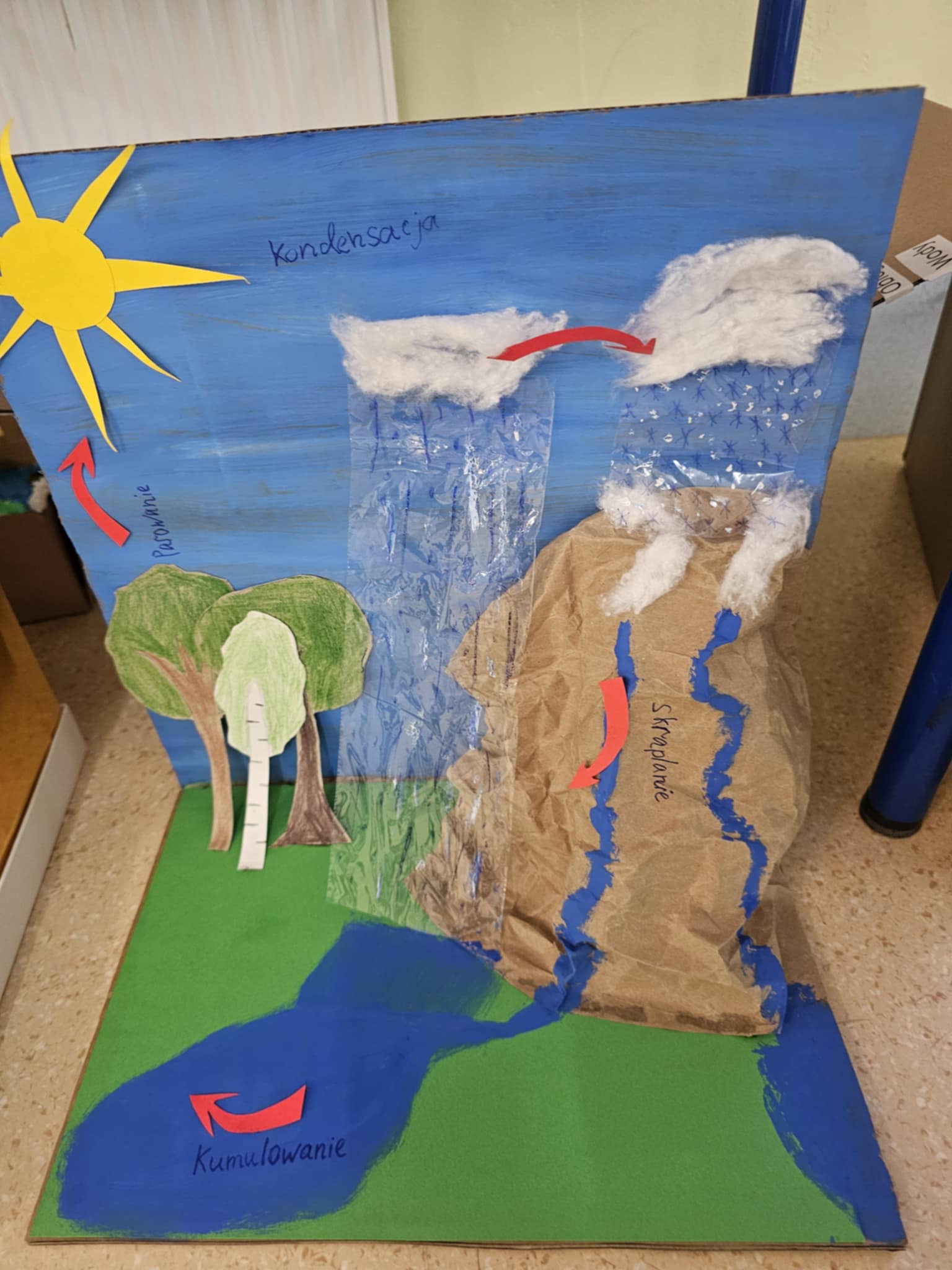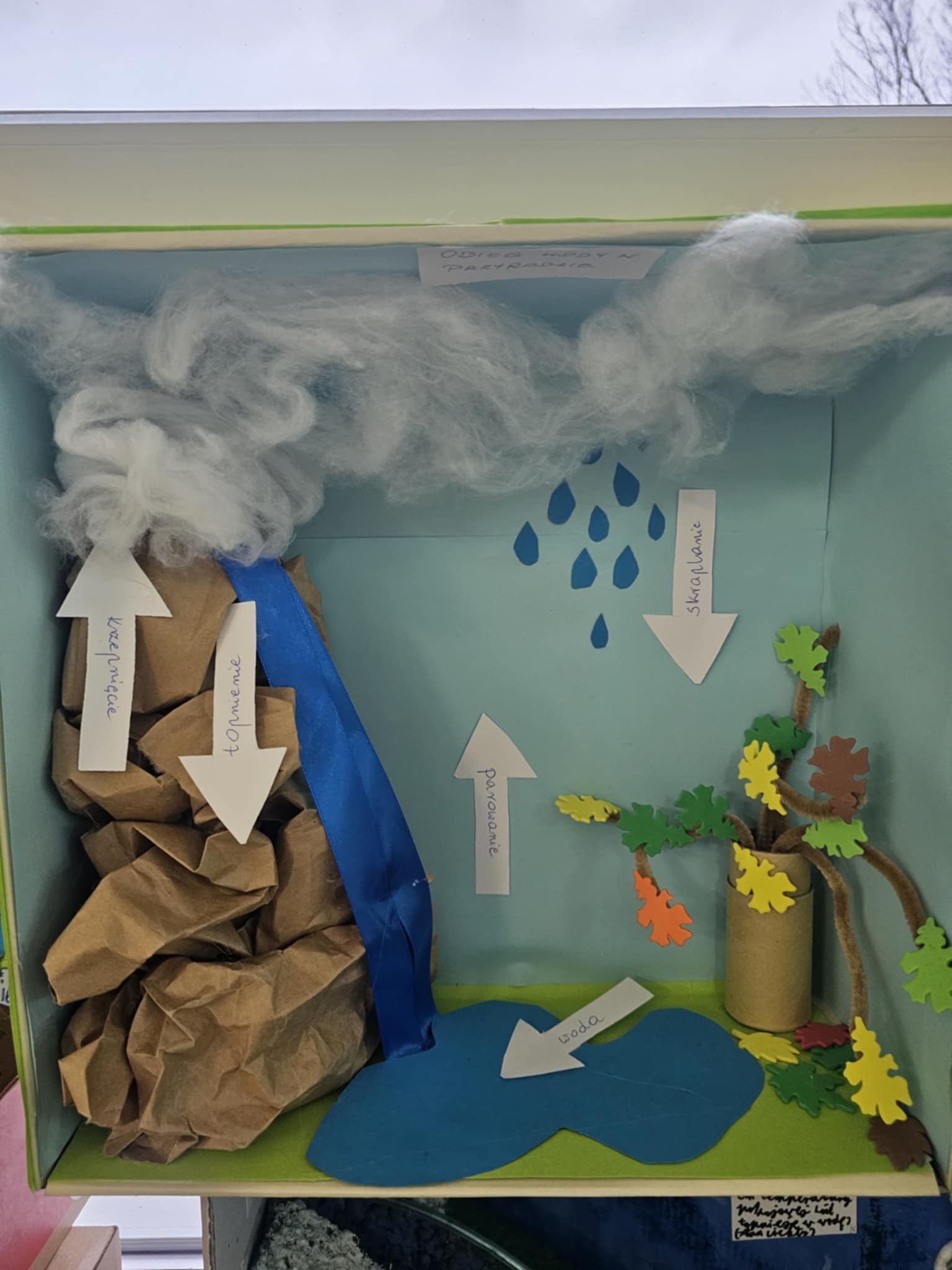 Podczas projektu dzieci poznały kolejne etapy obiegu wody oraz dowiedziały się, jak zmiany klimatu mogą wpływać na ten naturalny cykl. Najbardziej twórczą częścią zajęć było przygotowanie makiet przedstawiających obieg wody, wykonanych z różnorodnych materiałów: papieru, plasteliny, kartonów czy elementów recyklingowych.