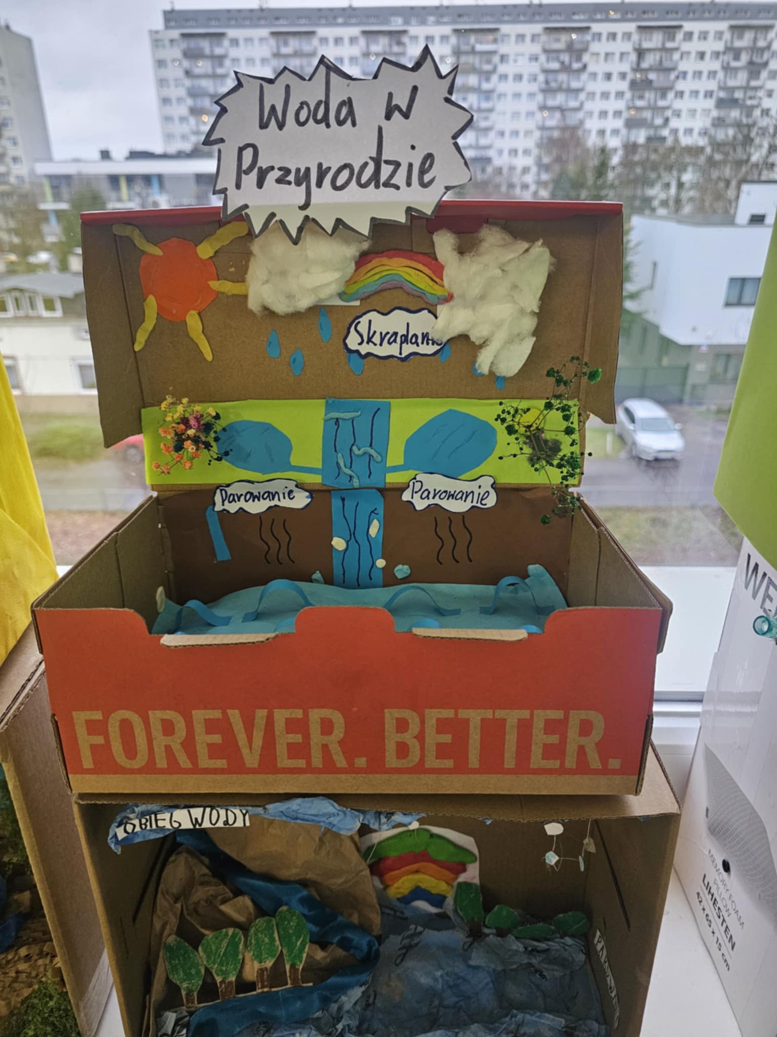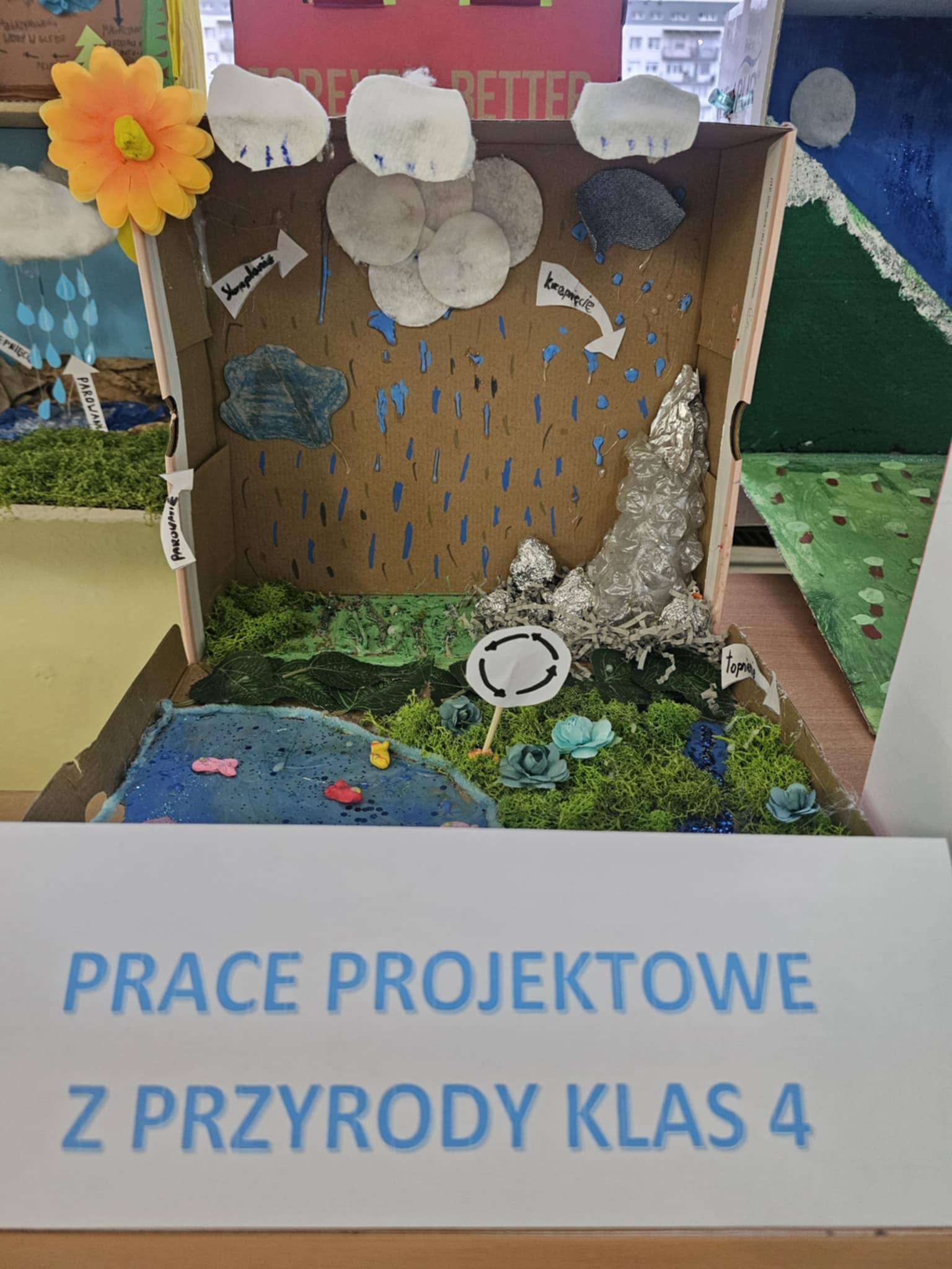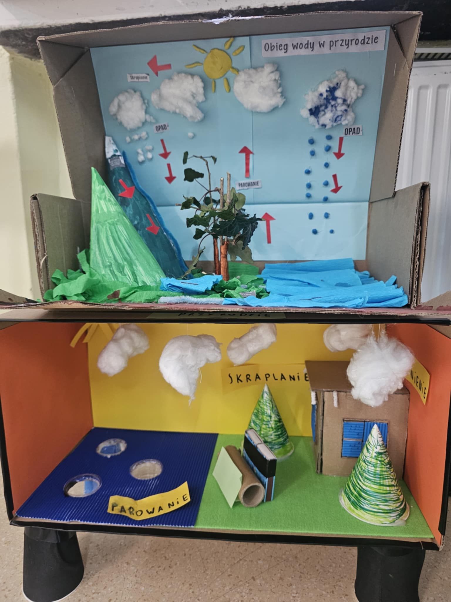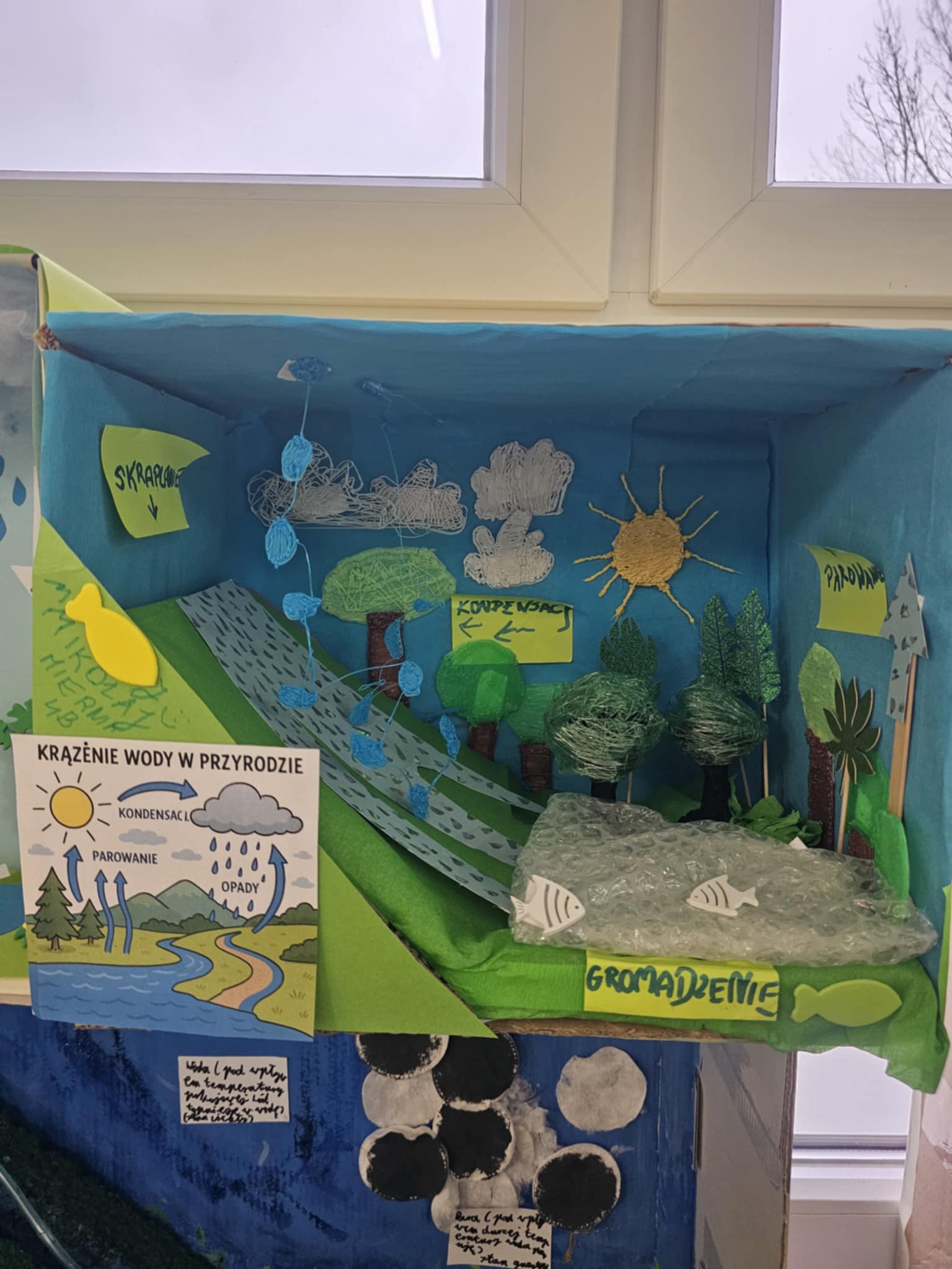 Podczas projektu dzieci poznały kolejne etapy obiegu wody oraz dowiedziały się, jak zmiany klimatu mogą wpływać na ten naturalny cykl. Najbardziej twórczą częścią zajęć było przygotowanie makiet przedstawiających obieg wody, wykonanych z różnorodnych materiałów: papieru, plasteliny, kartonów czy elementów recyklingowych.