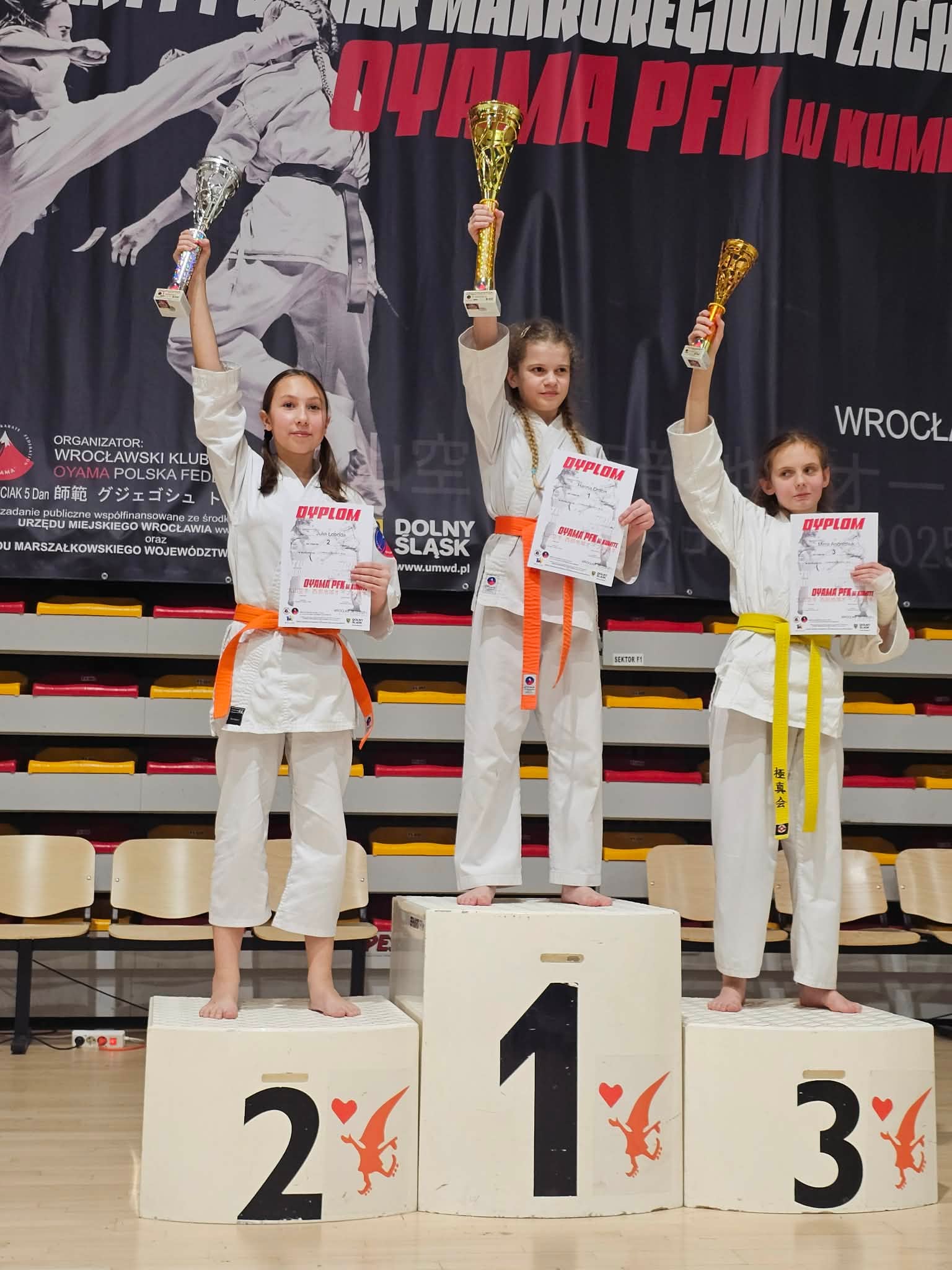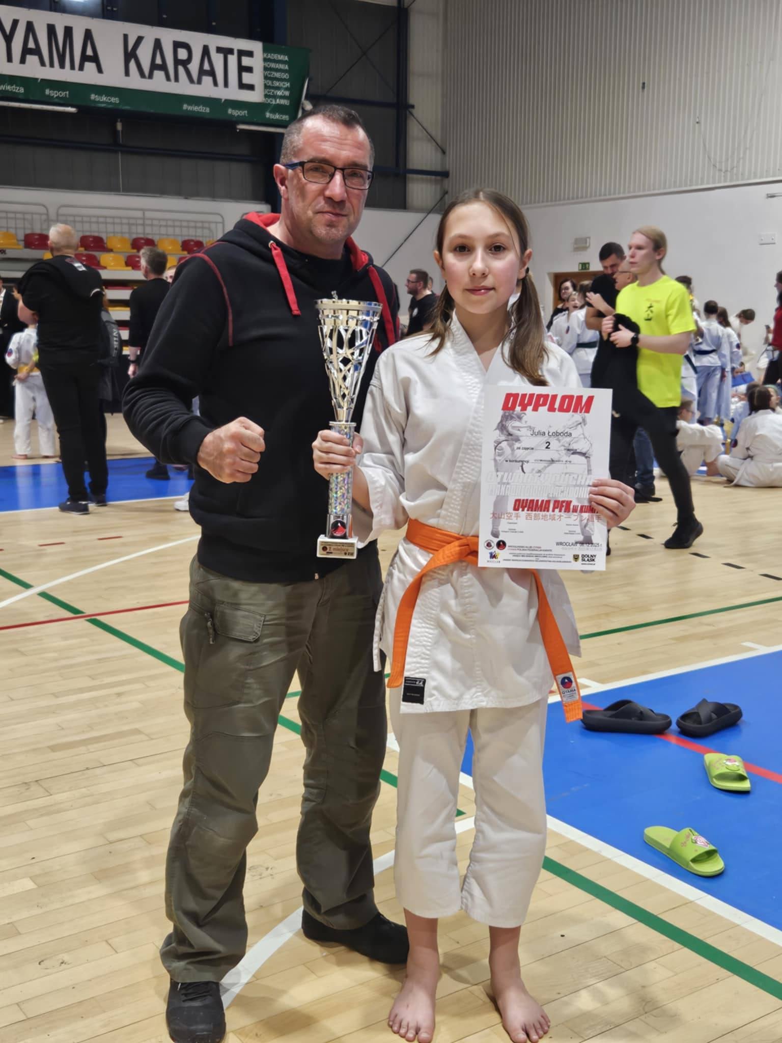 W sobotę 6 grudnia we Wrocławiu odbył się Otwarty Puchar Makroregionu Zachodniego Oyama PFK, w którym wystartowało ok 300 zawodników reprezentujących Oyama i Kyokushin karate. Nasza uczennica Julia Łoboda, we wspaniałym stylu wywalczyła drugie miejsce. Warto podkreślić, że Julia jest niezwykle skromna i pracowita, co w połączeniu z jej zaangażowaniem w sport, przynosi wymierne efekty medalowe. Turniej był niezwykle wymagający i we wszystkich kategoriach rozgrywano walki o 3 miejsce. Uczennica wchodziła w skład reprezentacji Łódzkiego Klubu Karate Neko który łącznie wywalczył aż 13 medali (5 złotych, 6 srebrnych, 2 brązowe) i zajął 3 miejsce w klasyfikacji generalnej turnieju. Serdecznie gratulujemy!