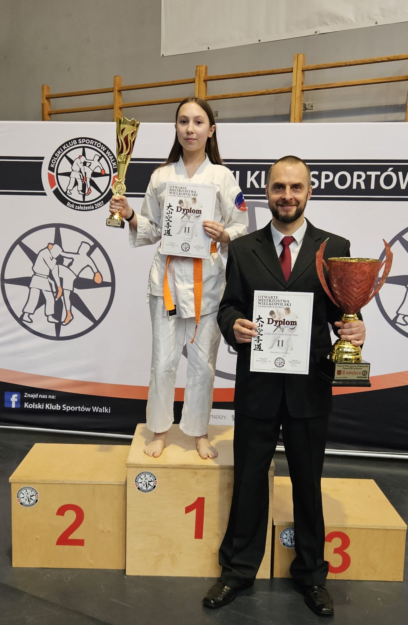 W sobotę 21 marca 2026 r. w Kole odbyły się Otwarte Mistrzostwa Wielkopolski Oyama PFK w kumite w których udział wzięło 169 zawodników z 13 klubów Oyama i Kyokushin karate. Wśród nich wystartowała nasza uczennica Julia Łoboda, która spisała się znakomicie i wywalczyła srebrny medal w kategorii U-14. Był to pierwszy start Julki w roku 2026 i miejmy nadzieję, że ten wynik jest optymistyczną zapowiedzą przyszłych sukcesów. Uczennica wchodziła w skład reprezentacji Łódzkiego Klubu Oyama Karate Neko, który łącznie wywalczył aż 16 medali (złotox5, srebrox8, brązx3), a w klasyfikacji drużynowej zajął 2 miejsce. Serdecznie gratulujemy!