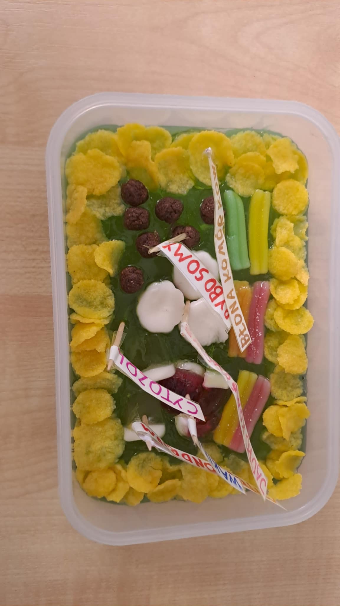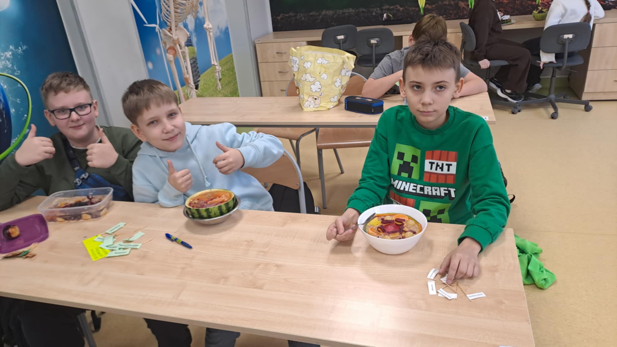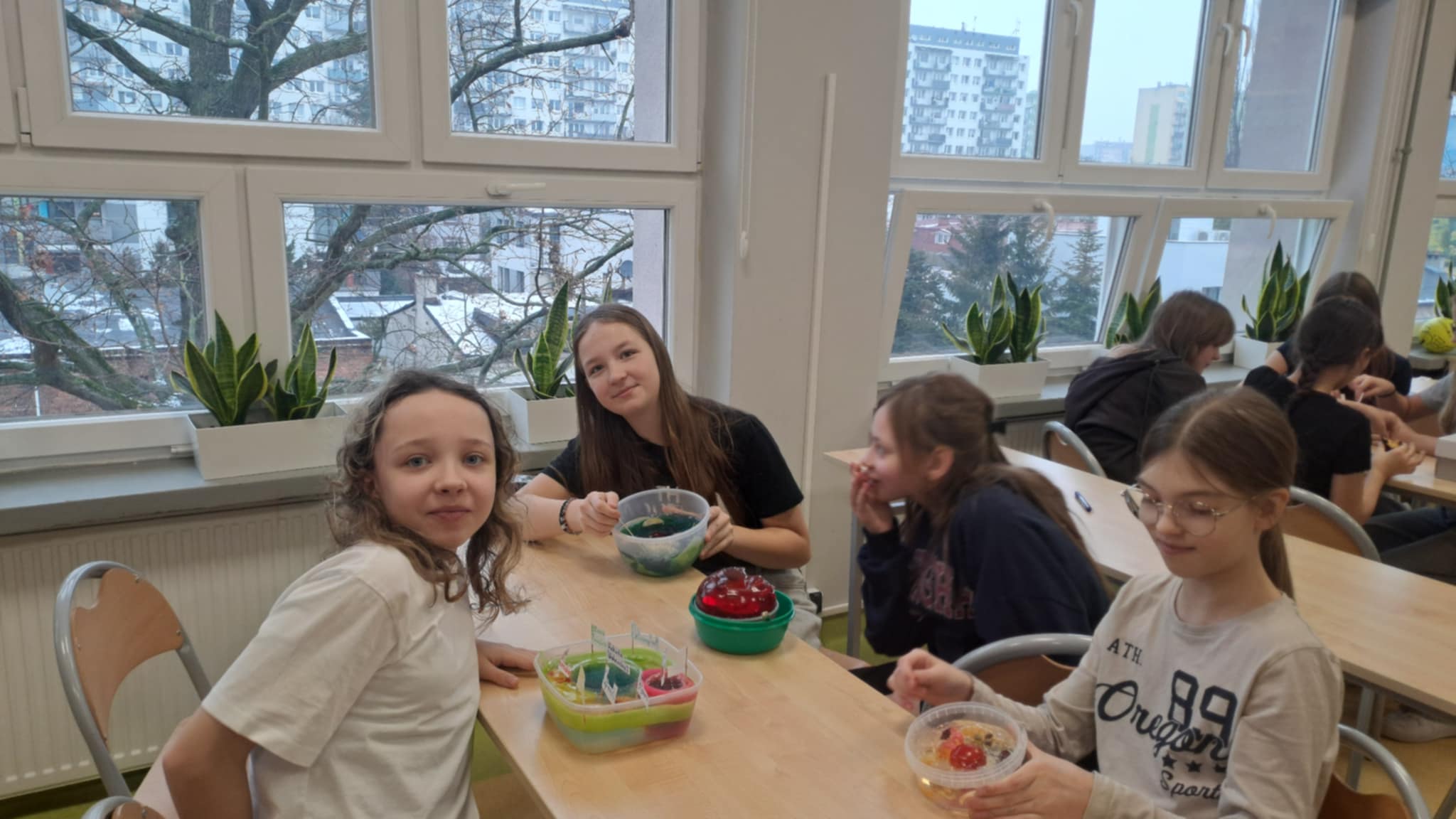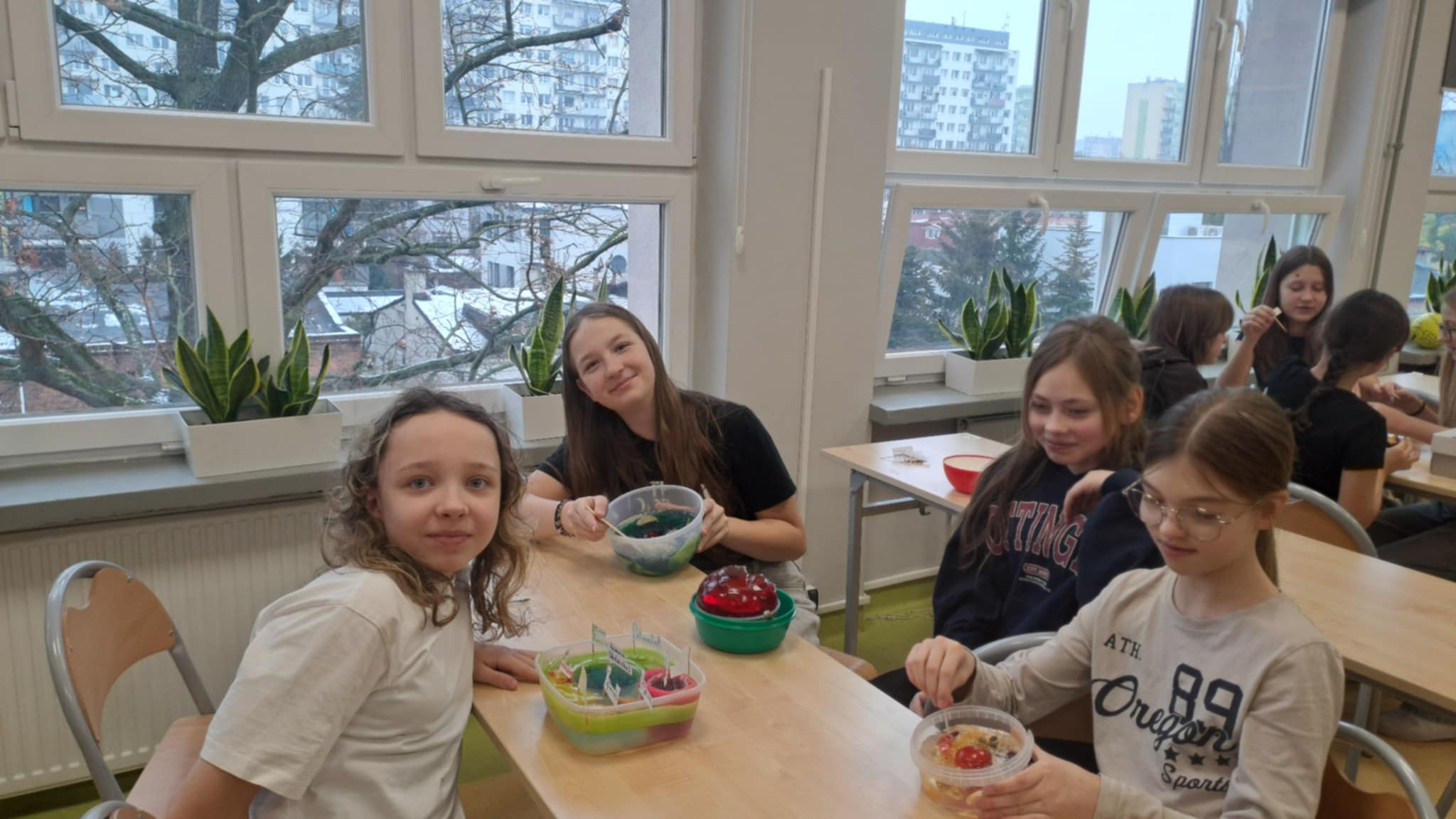 Galaretka stała się cytoplazmą, owoce pełniły rolę organelli, a żelki i pianki odgrywały funkcję struktur komórkowych, których nazwy na co dzień brzmią naprawdę poważnie. Dzięki temu nietypowemu doświadczeniu piątoklasiści nie tylko świetnie się bawili, ale także utrwalili wiedzę o budowie komórki w najbardziej smakowity sposób.
