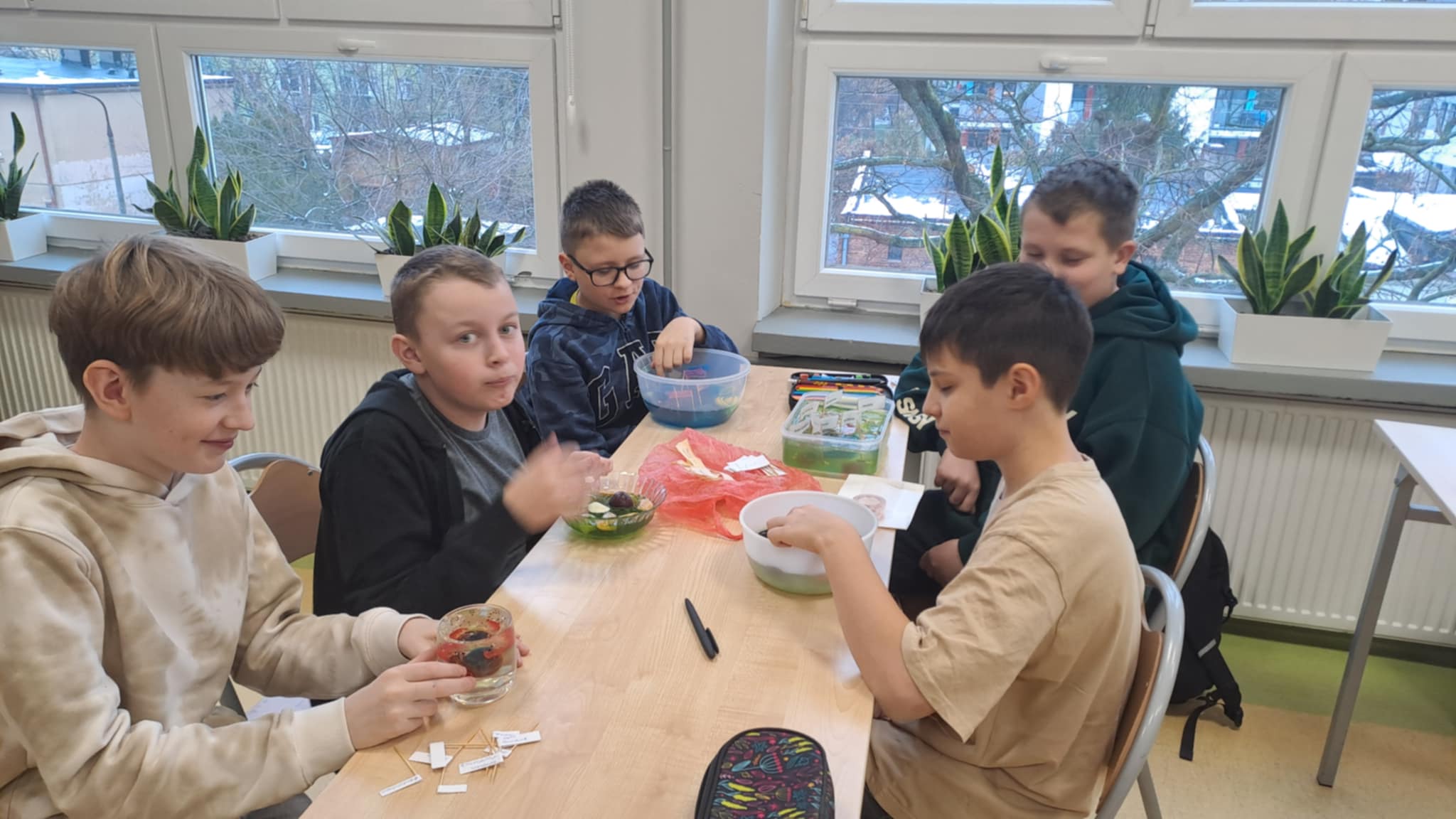 Na lekcji biologii w klasach 5 zrobiło się wyjątkowo słodko i naukowo jednocześnie! Uczniowie zamienili się w młodych biologów–kucharzy i przygotowali modele komórek zwierzęcych z galaretek oraz różnych produktów spożywczych.