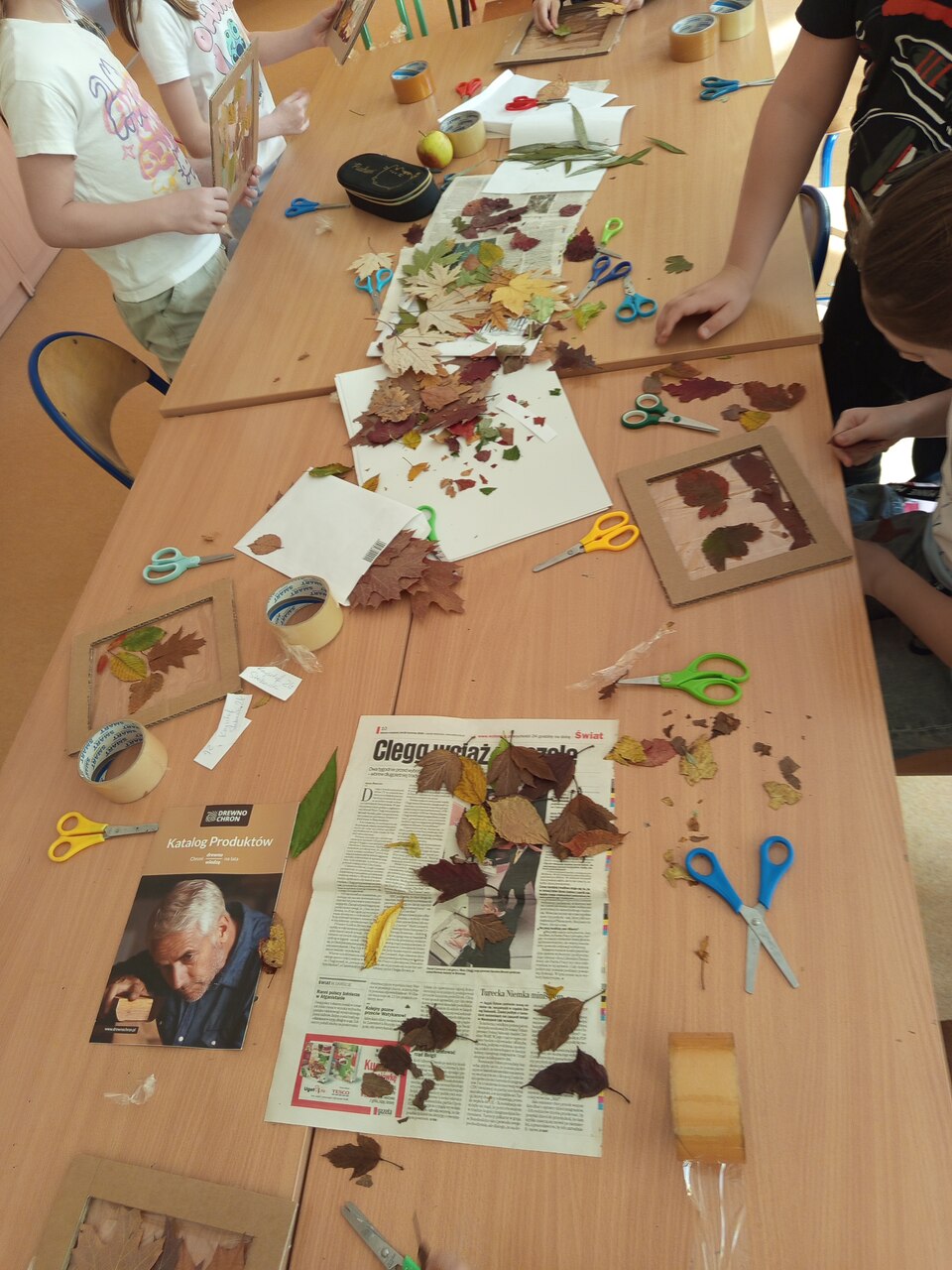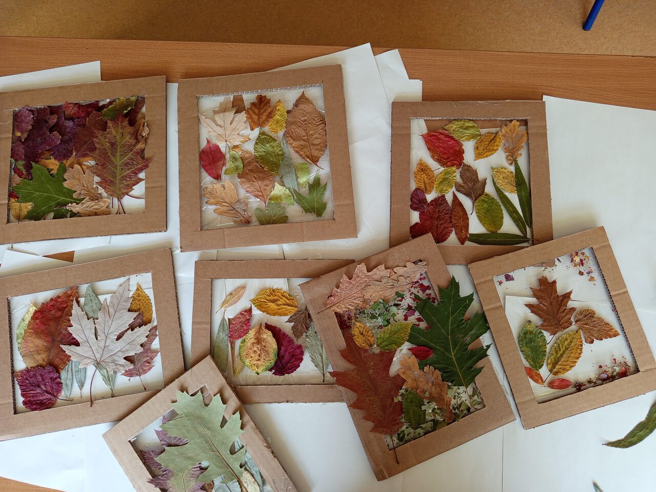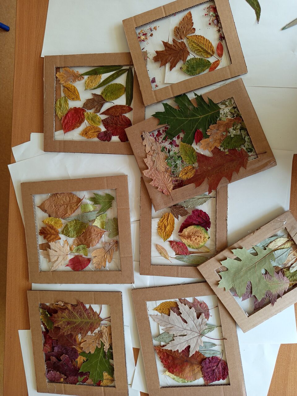Witraże jesienne. A to była jeszcze jedna zabawa liśćmi. Tym razem na kartonowych ramkach powstały witraże.