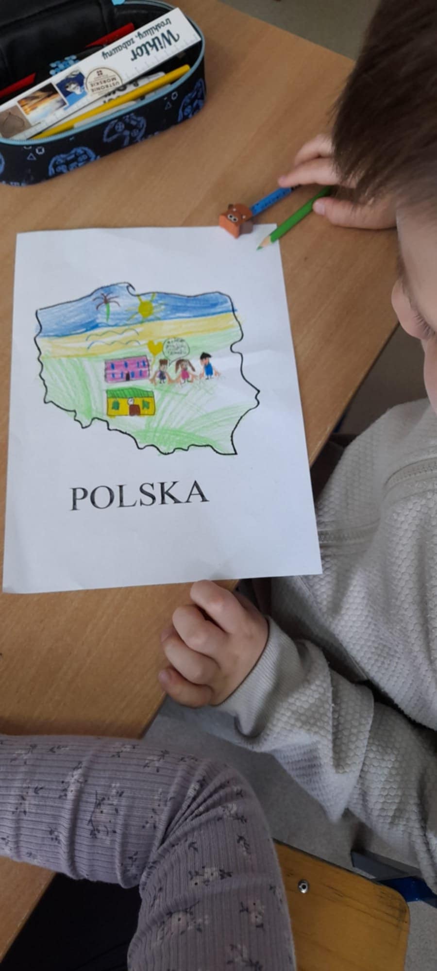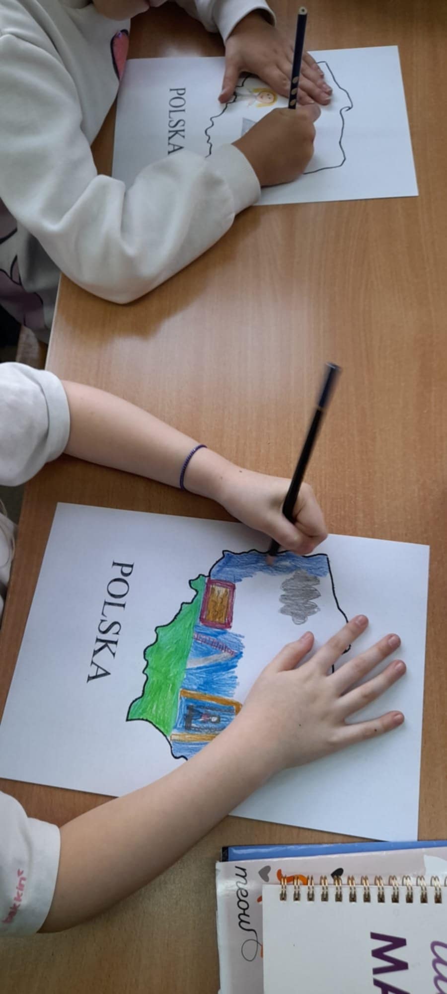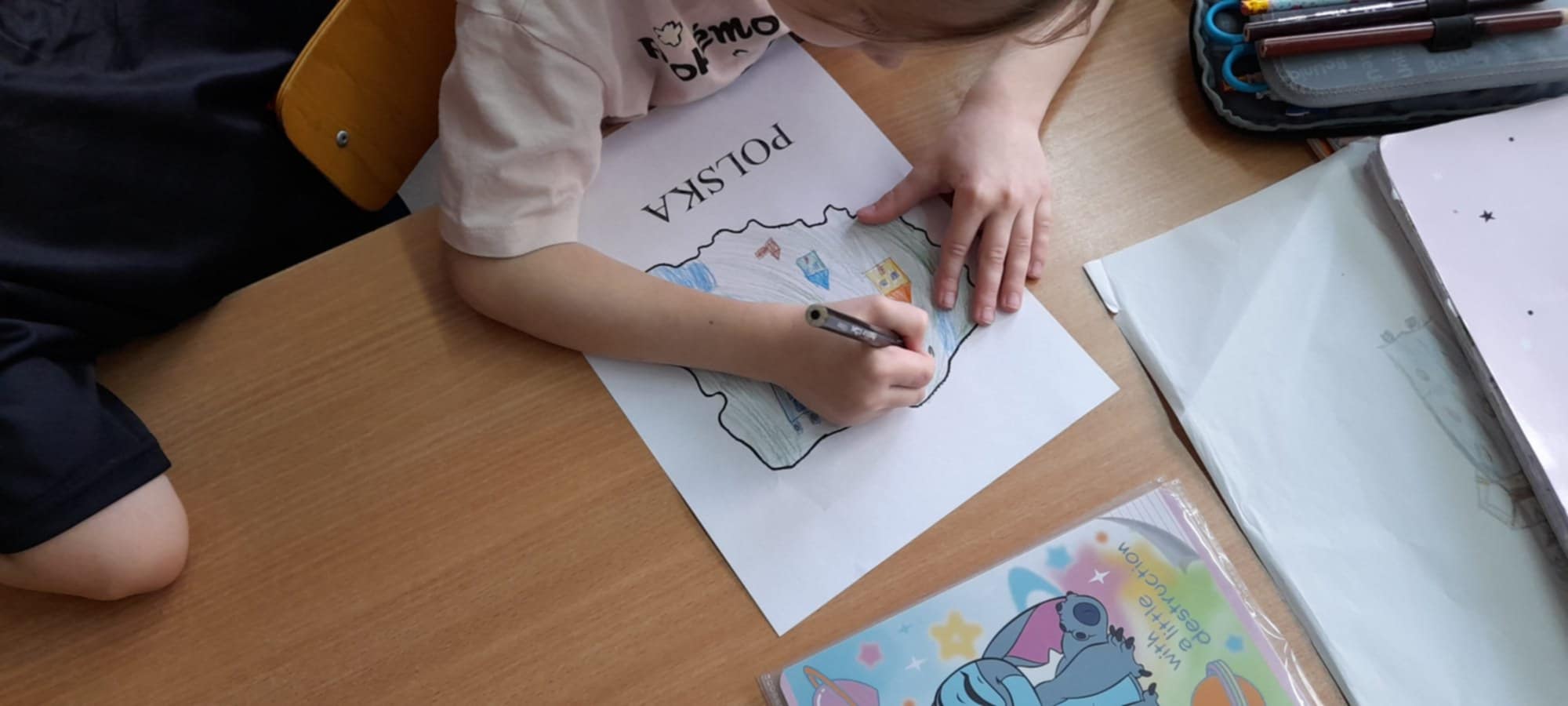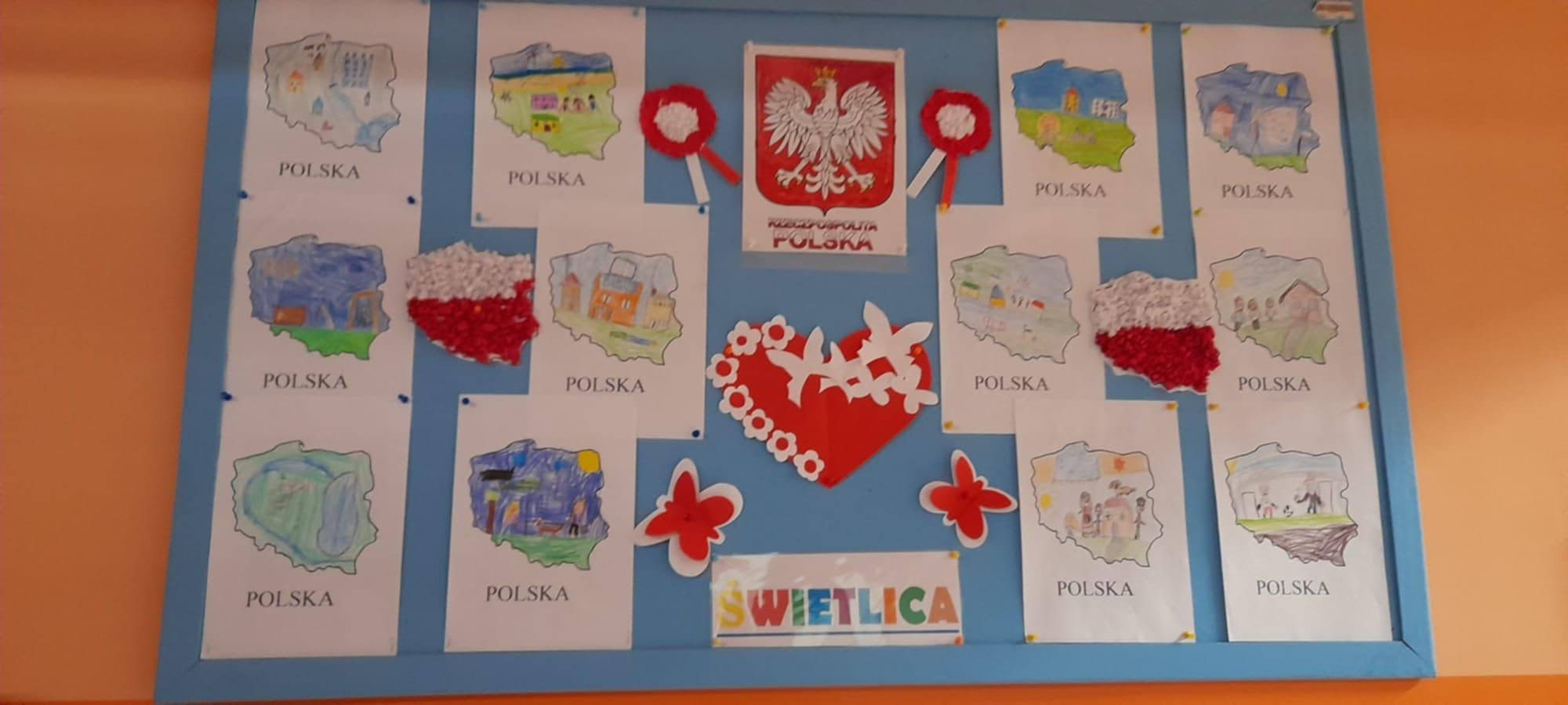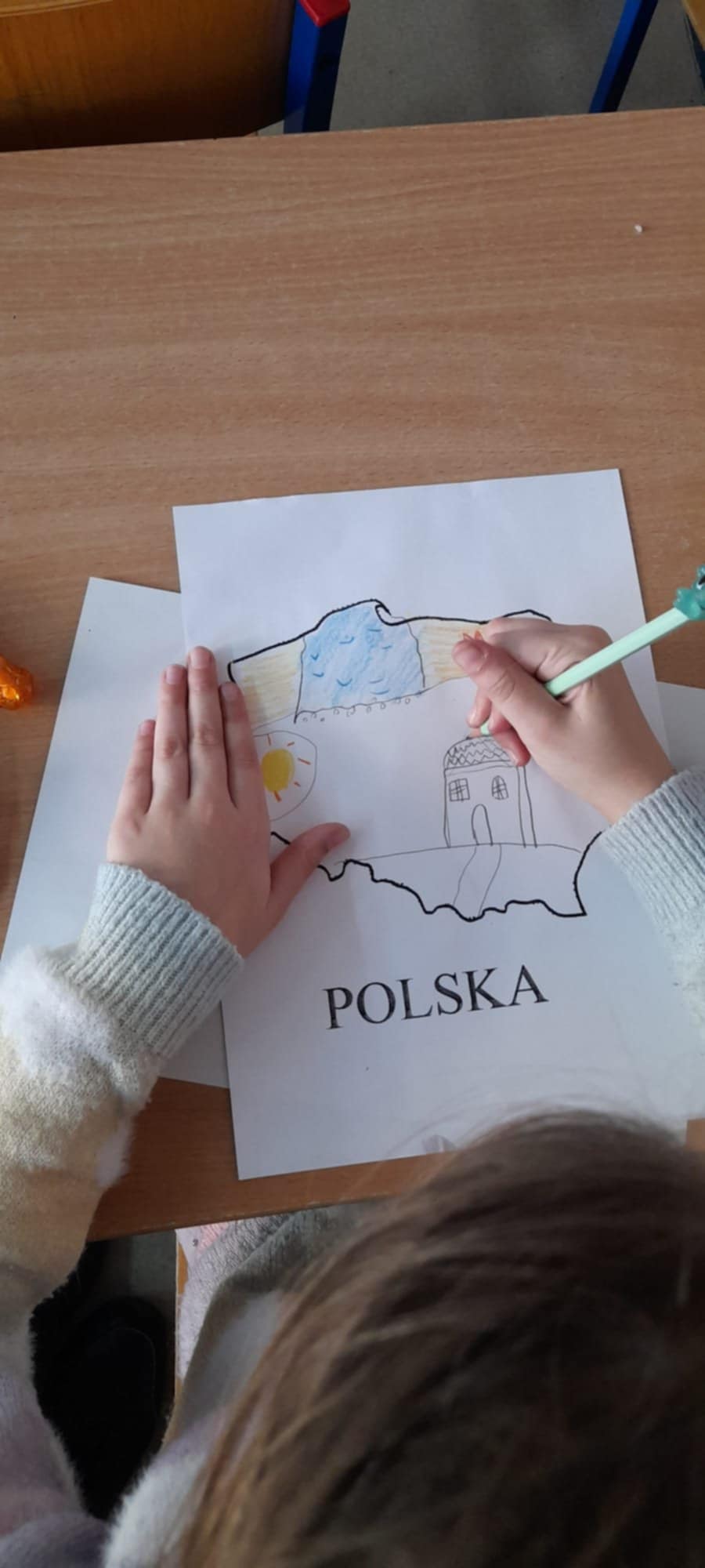 Dzisiaj uczniowie klasy 1a i 2a wypełniali kontur Polski, odpowiadając w ten sposób "Za co jestem wdzięczny Polsce". Z prac została wykonana dekoracja na korytarzu szkolnym.