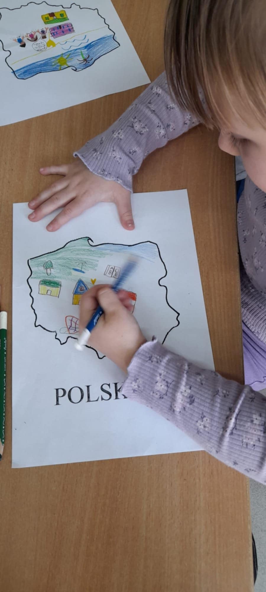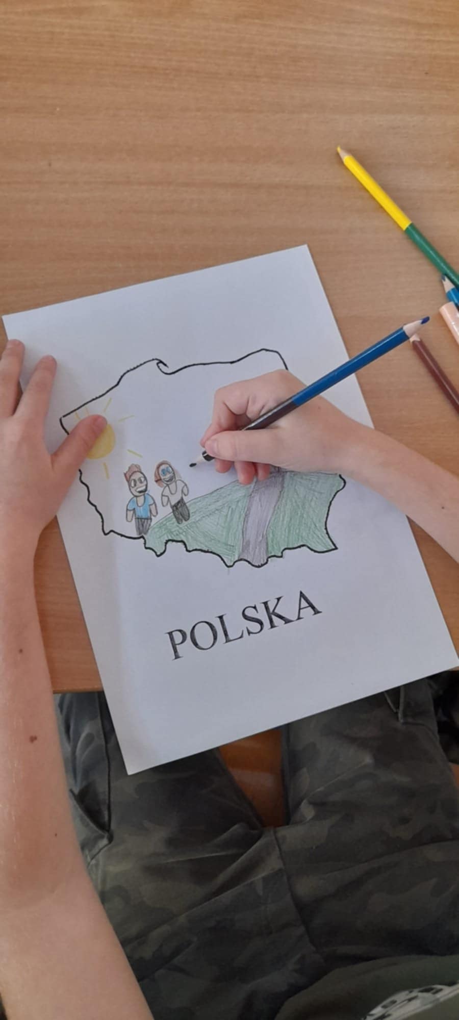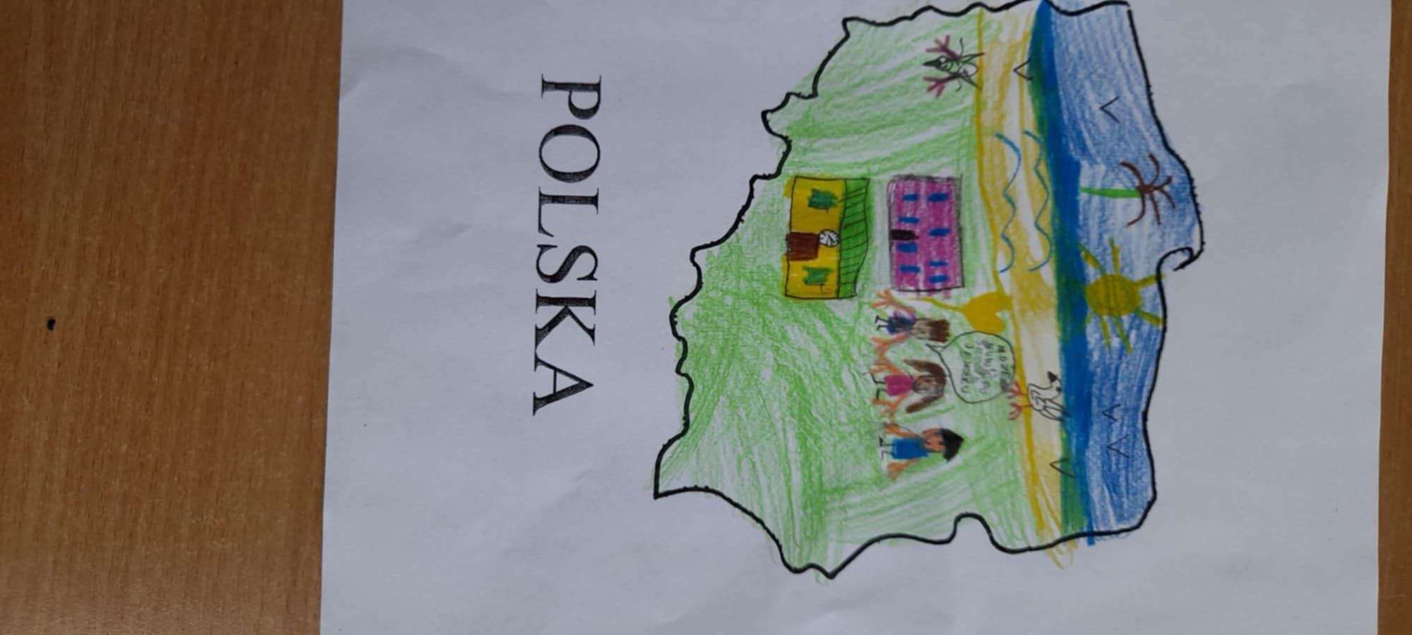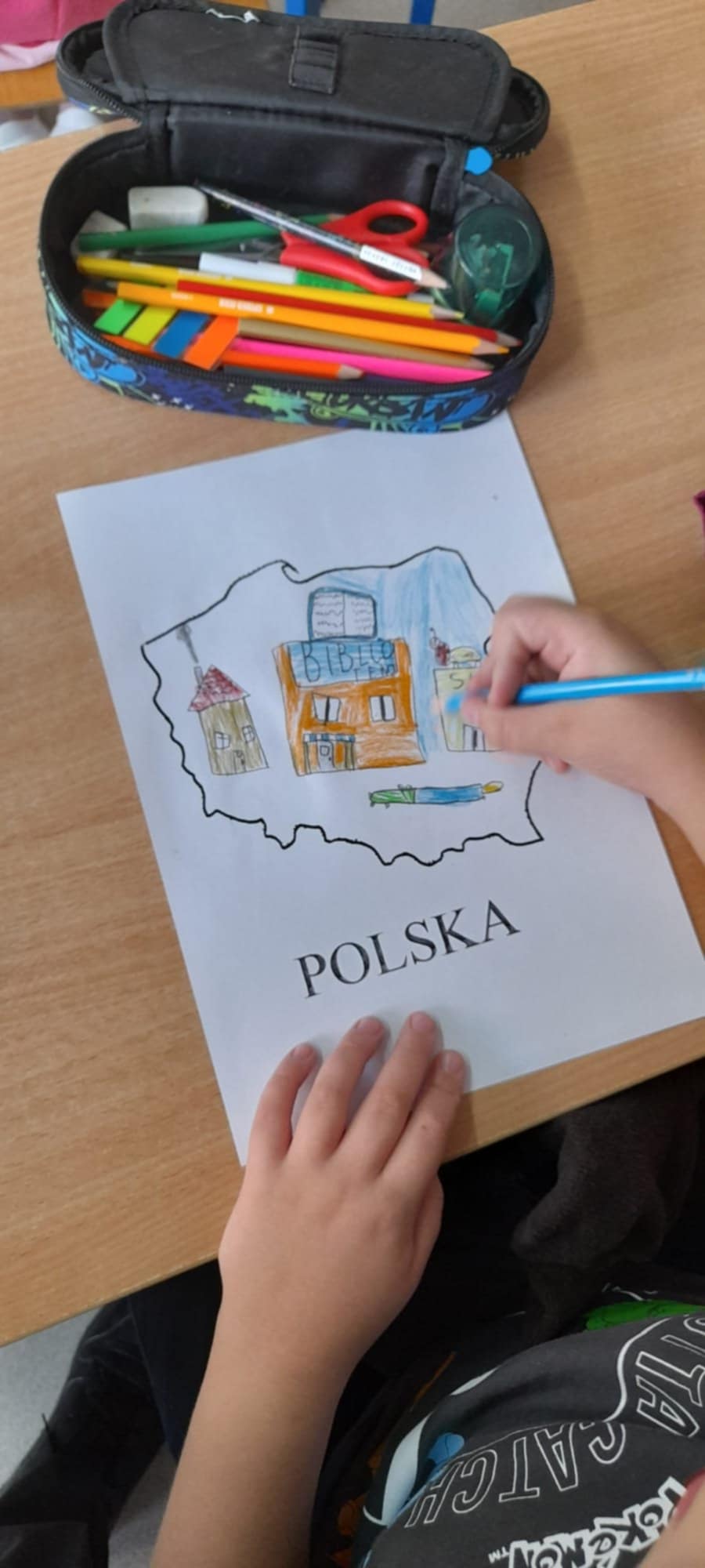 Dzisiaj uczniowie klasy 1a i 2a wypełniali kontur Polski, odpowiadając w ten sposób "Za co jestem wdzięczny Polsce". Z prac została wykonana dekoracja na korytarzu szkolnym.